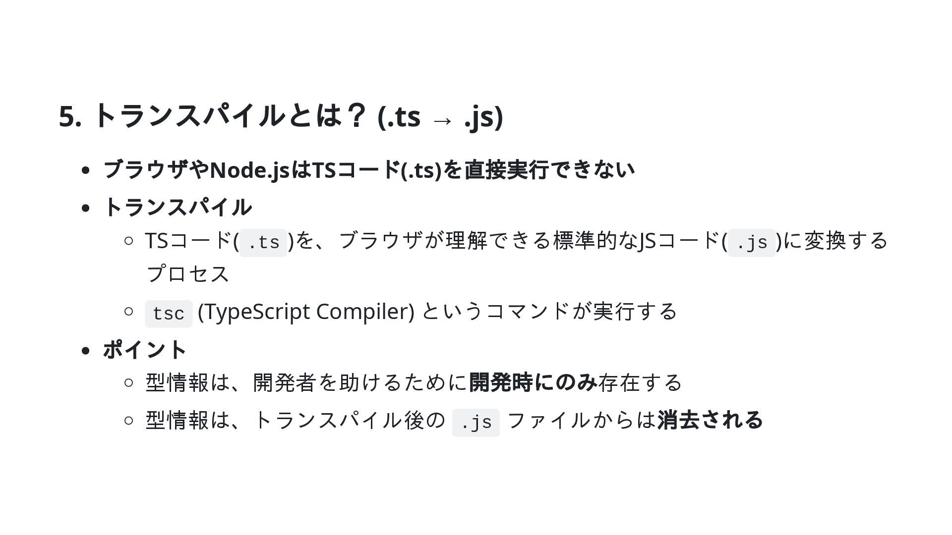 TSコード( .ts )を、ブラウザが理解できる標準的なJSコード( .js )に変換する プロセス tsc (TypeScript Compiler) というコマンドが実行する ポイント 型情報は、開発者を助けるために 開発時にのみ存在する 型情報は、トランスパイル後の .js ファイルからは 消去される