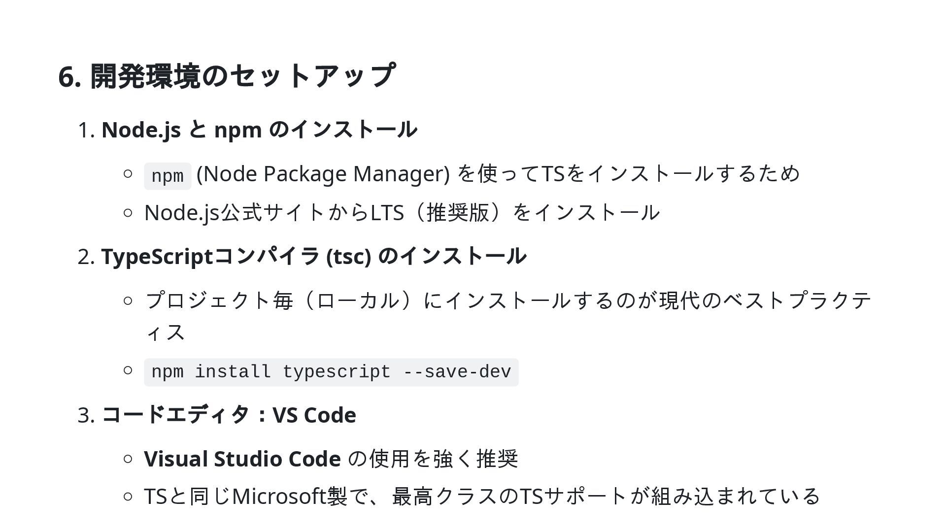 Manager) を使ってTSをインストールするため Node.js公式サイトからLTS(推奨版)をインストール 2. TypeScript コンパイラ (tsc) のインストール プロジェクト毎(ローカル)にインストールするのが現代のベストプラクテ ィス npm install typescript --save-dev 3. コードエディタ:VS Code Visual Studio Code の使用を強く推奨 TSと同じMicrosoft製で、最高クラスのTSサポートが組み込まれている