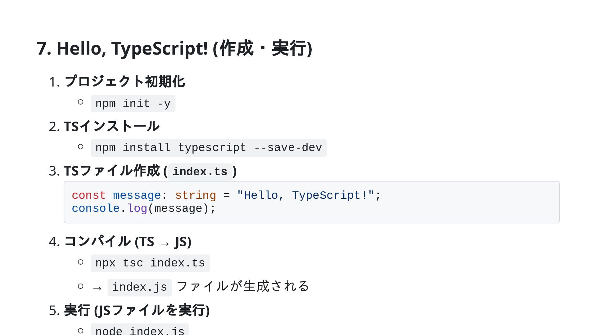 2. TS インストール npm install typescript --save-dev 3. TS ファイル作成 ( index.ts ) const message: string = "Hello, TypeScript!"; console.log(message); 4. コンパイル (TS → JS) npx tsc index.ts → index.js ファイルが生成される 5. 実行 (JS ファイルを実行)