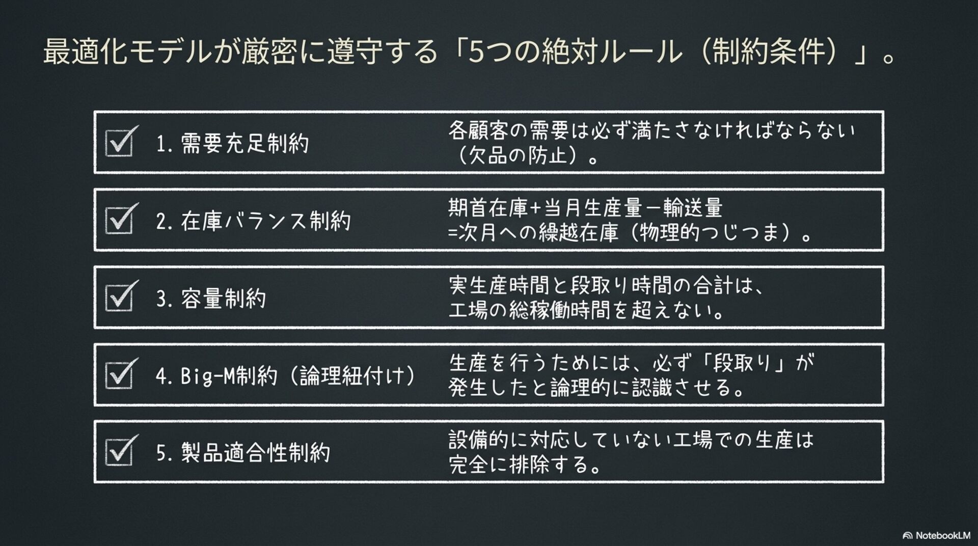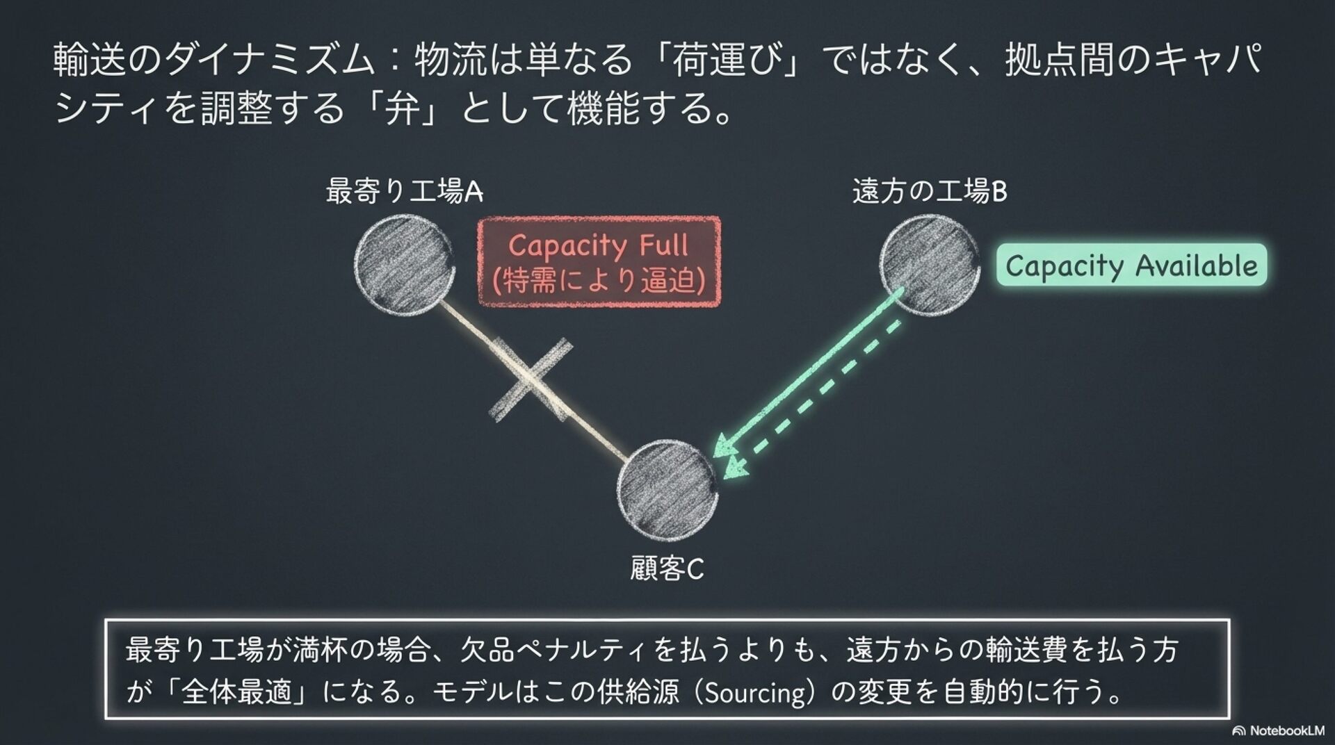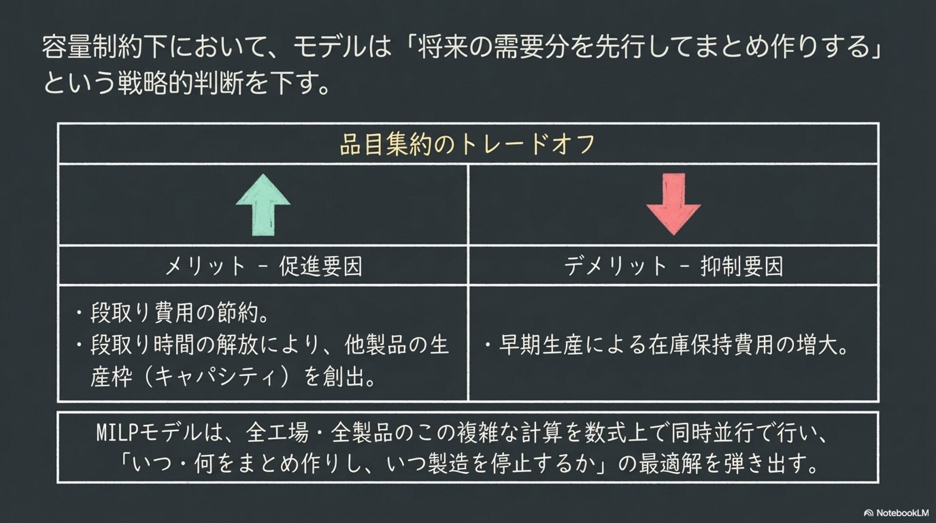 複数の工場と多品目の製品を対象とした、生産と配送の計画を統合的に最適化する数理モデルについて解説しています。従来の部門ごとの個別最適化が招く不整合を解消するため、混合整数線形計画法(MILP)を用いてシステム全体のコスト最小化を目指す手法を提案しています。特に、生産準備に伴う「段取り時間」が工場の生産容量を圧迫するという現実的な制約を重視し、在庫保持と輸送効率の複雑なトレードオフを計算しています。このモデルを導入することで、物流コストの削減や需要変動への柔軟な対応が可能になることが示唆されています。また、計算負荷を軽減するための高度な解法アルゴリズムや、家具・食品業界における具体的な適用事例についても紹介されています。データに基づいた戦略的な意思決定により、サプライチェーン全体の競争力を高めるための包括的なフレームワークを提供しています。