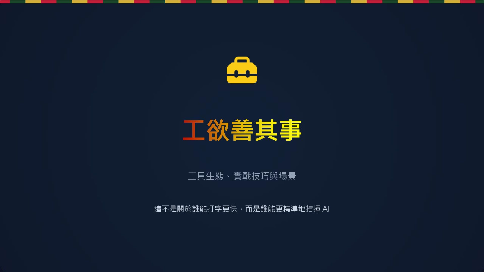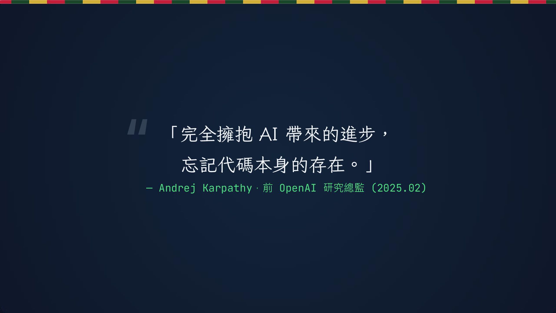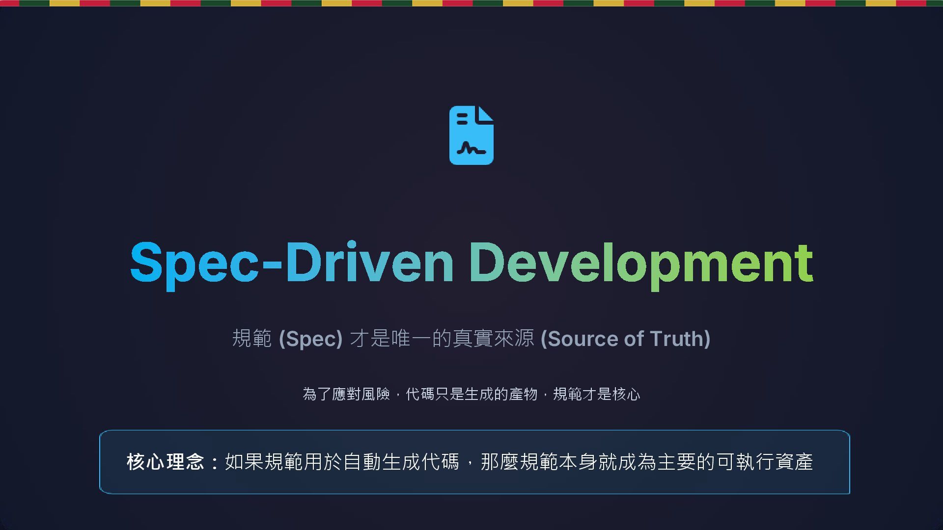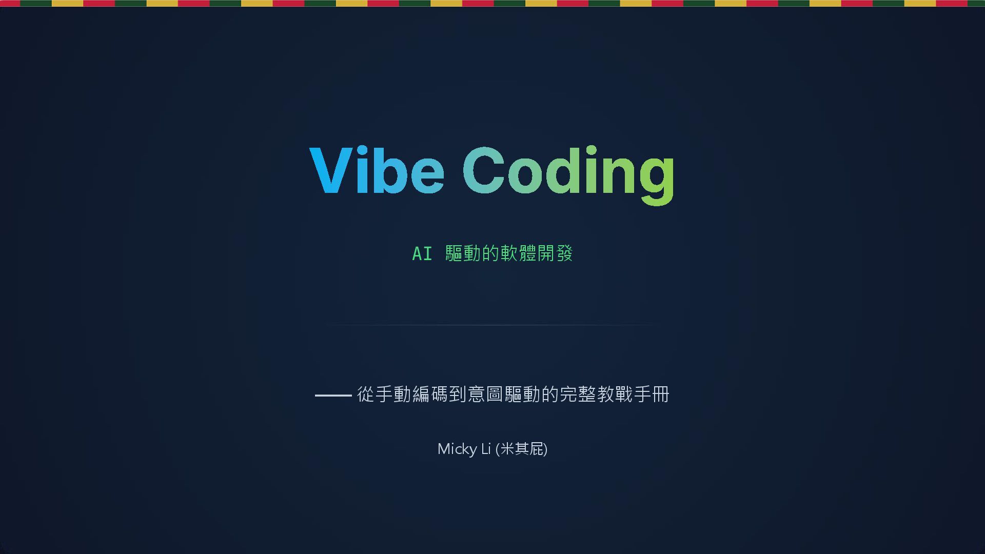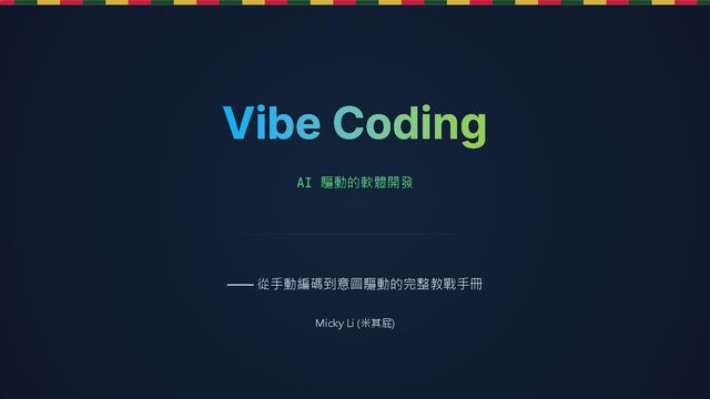 這是一份針對 2025 年 AI 軟體開發時代的實戰指南。核心概念是「Vibe Coding」(意圖驅動開發),主張工程師應從關注「語法細節 (Syntax)」轉向關注「意圖與結果 (Intent)」。第一次發表日期為 2025.12.24 ,是聖誕節版本的簡報。