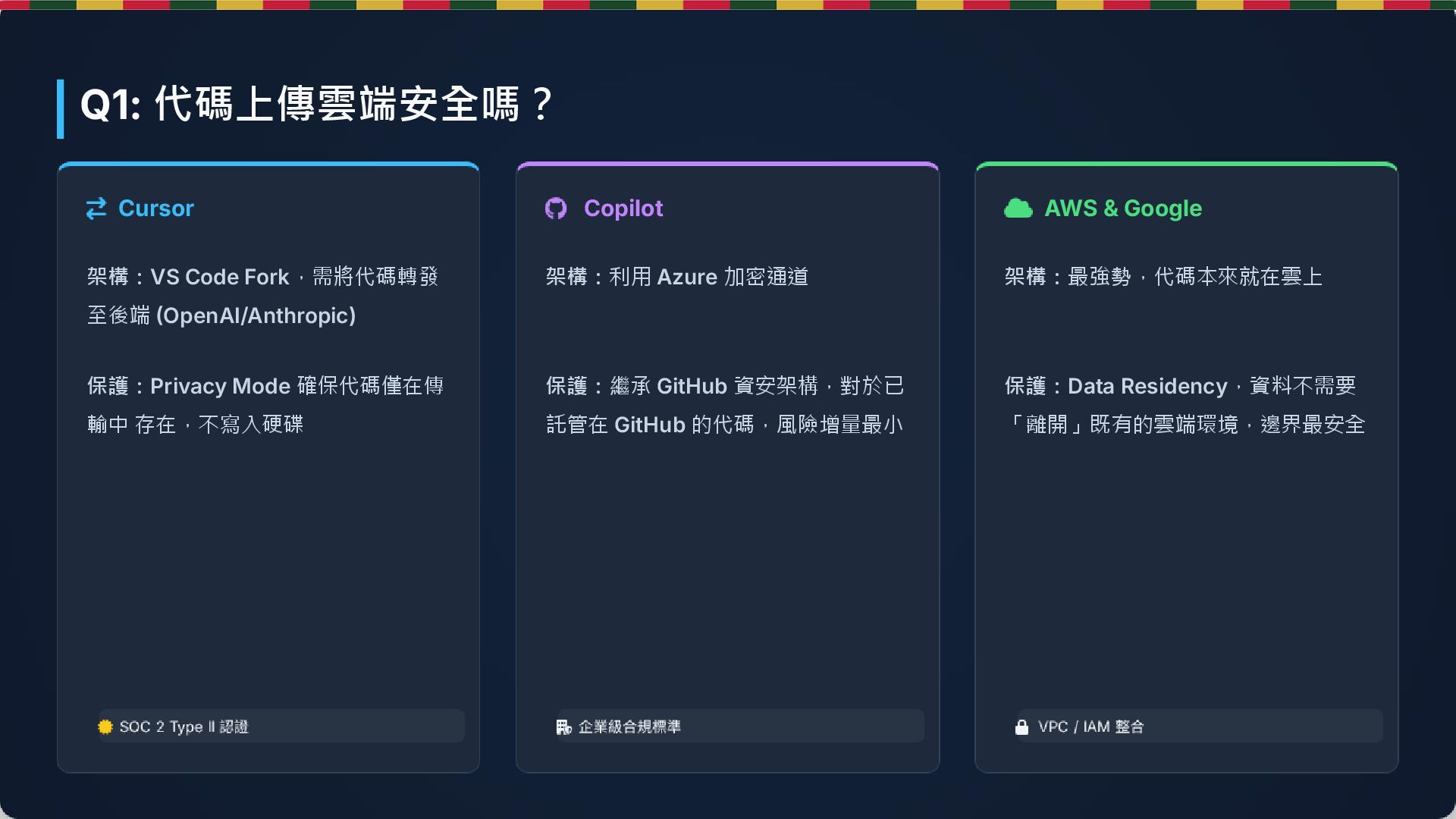保護:Privacy Mode 確保代碼僅在傳 輸中 存在,不寫入硬碟 架構:利用 Azure 加密通道 保護:繼承 GitHub 資安架構,對於已 託管在 GitHub 的代碼,風險增量最小 架構:最強勢,代碼本來就在雲上 保護:Data Residency,資料不需要 「離開」既有的雲端環境,邊界最安全 Q1: 代碼上傳雲端安全嗎?