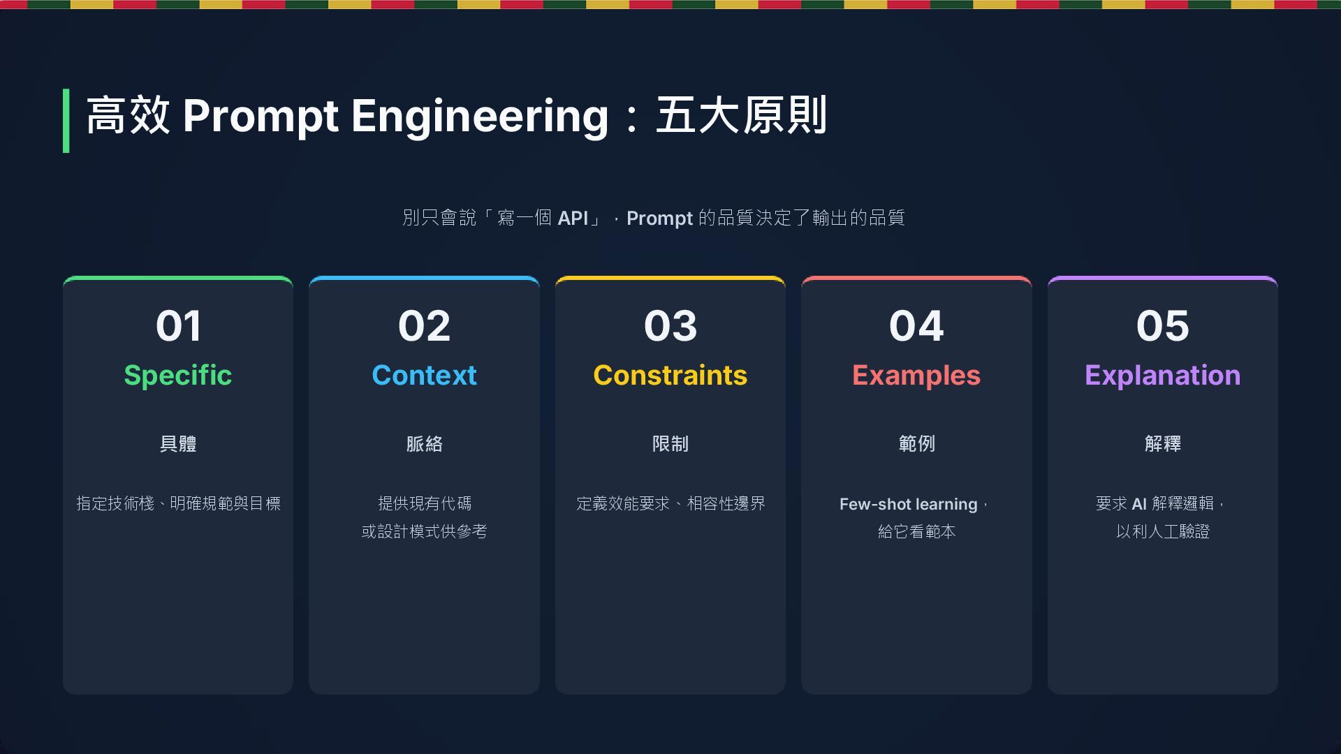Constraints 限制 定義效能要求、相容性邊界 04 Examples 範例 Few-shot learning, 給它看範本 05 Explanation 解釋 要求 AI 解釋邏輯, 以利人工驗證 高效 Prompt Engineering:五大原則 別只會說「寫一個 API」,Prompt 的品質決定了輸出的品質