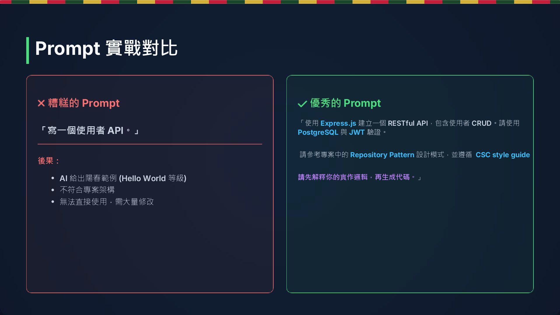 RESTful API,包含使用者 CRUD。請使用 PostgreSQL 與 JWT 驗證。 請參考專案中的 Repository Pattern 設計模式,並遵循 CSC style guide 請先解釋你的實作邏輯,再生成代碼。」 • AI 給出陽春範例 (Hello World 等級) • 不符合專案架構 • 無法直接使用,需大量修改 Prompt 實戰對比