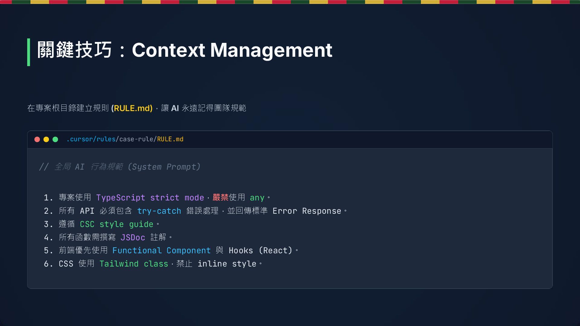 11. 在專案根目錄建立規則 (RULE.md),讓 AI 永遠記得團隊規範 // 全局 AI 行為規範 (System Prompt)