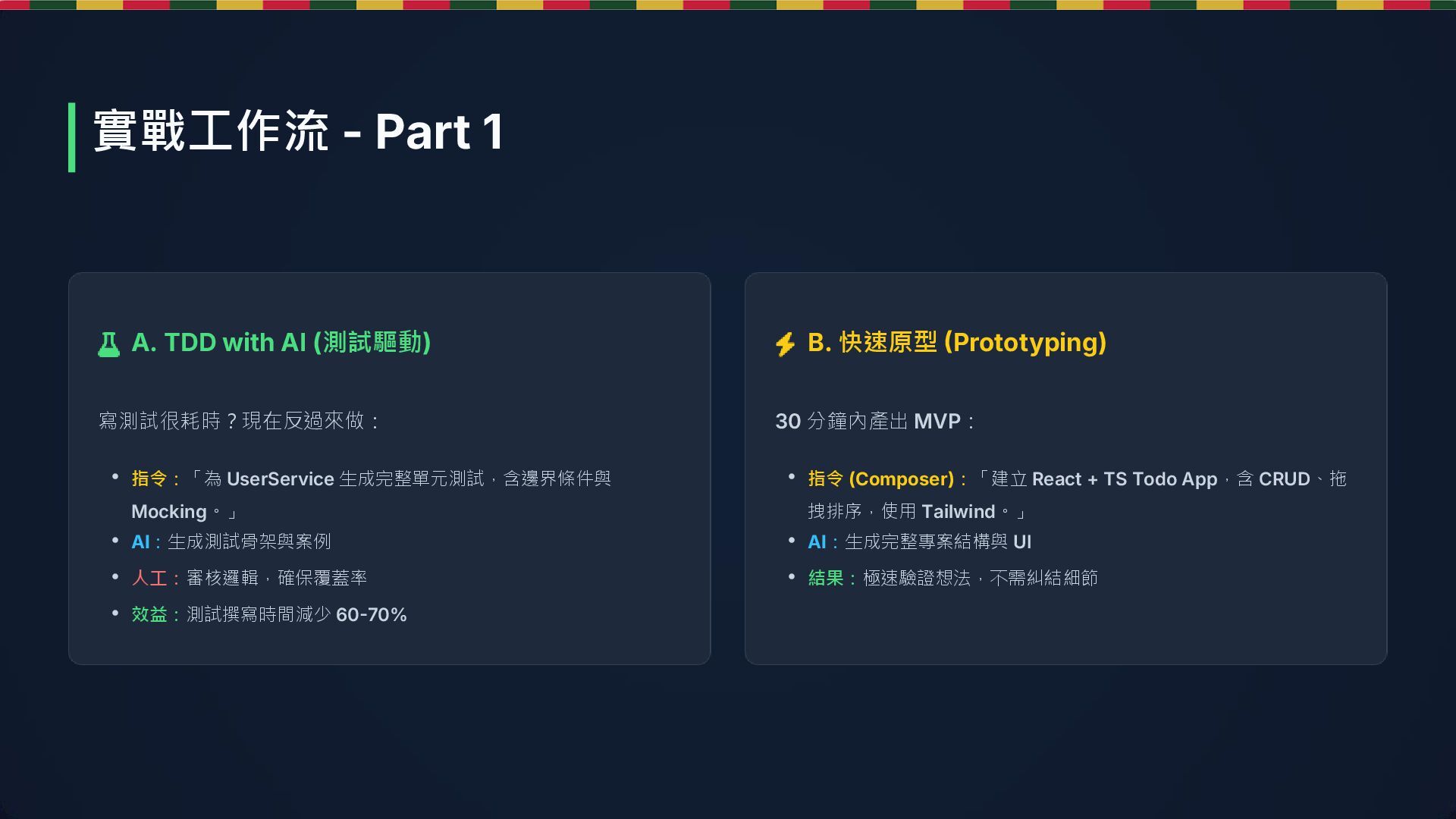 分鐘內產出 MVP: • 指令:「為 UserService 生成完整單元測試,含邊界條件與 Mocking。」 • AI:生成測試骨架與案例 • 人工:審核邏輯,確保覆蓋率 • 效益:測試撰寫時間減少 60-70% • 指令 (Composer):「建立 React + TS Todo App,含 CRUD、拖 拽排序,使用 Tailwind。」 • AI:生成完整專案結構與 UI • 結果:極速驗證想法,不需糾結細節 實戰工作流 - Part 1