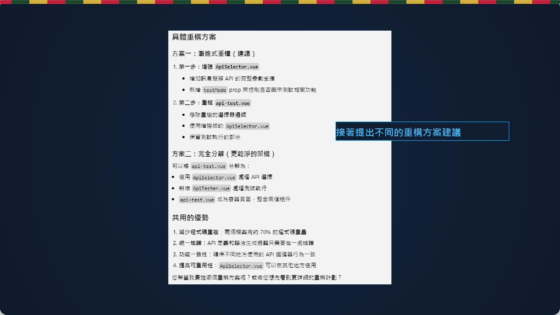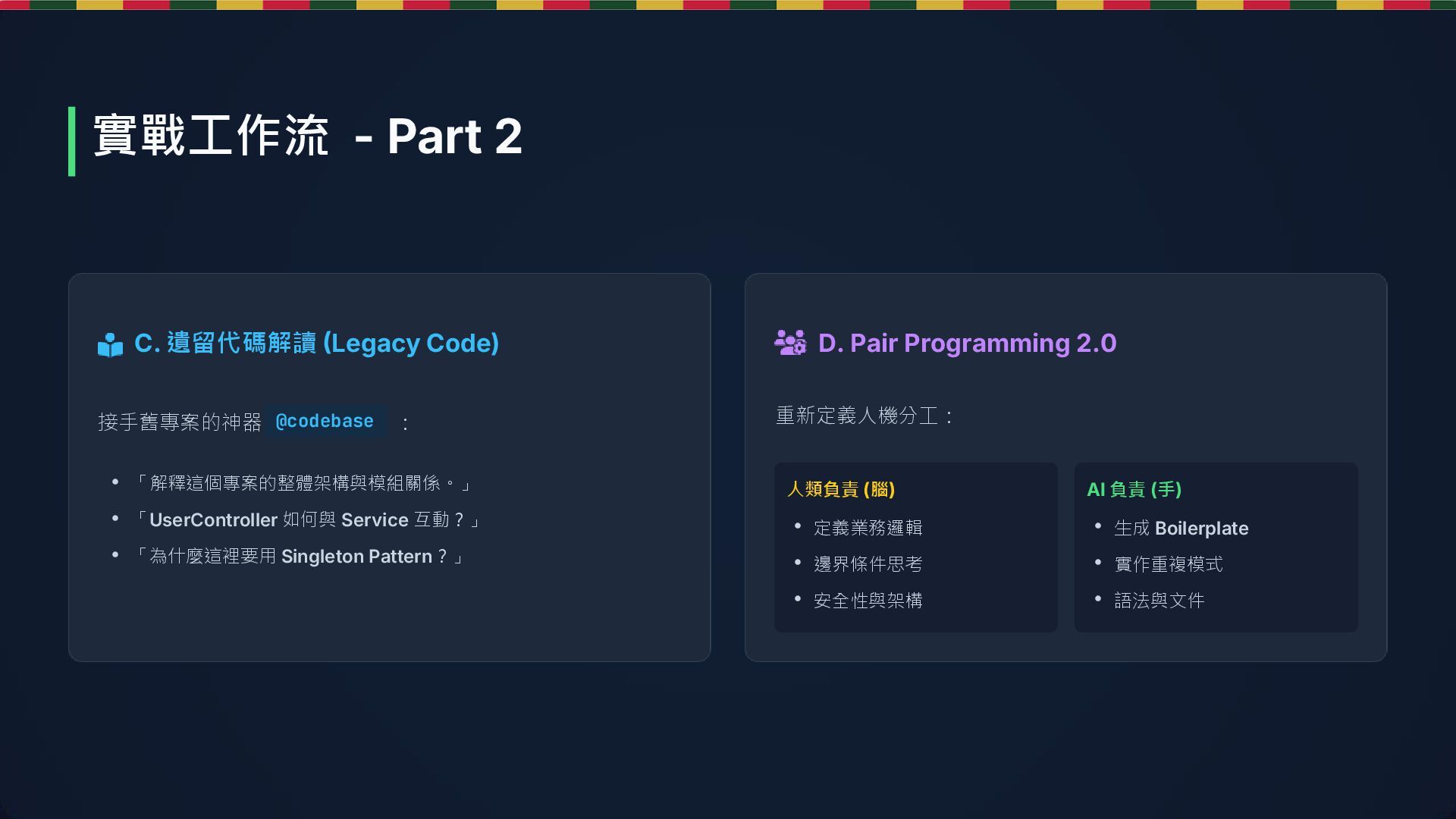 重新定義人機分工: • 「解釋這個專案的整體架構與模組關係。」 • 「UserController 如何與 Service 互動?」 • 「為什麼這裡要用 Singleton Pattern?」 人類負責 (腦) AI 負責 (手) • 定義業務邏輯 • 邊界條件思考 • 安全性與架構 • 生成 Boilerplate • 實作重複模式 • 語法與文件 實戰工作流 - Part 2 @codebase