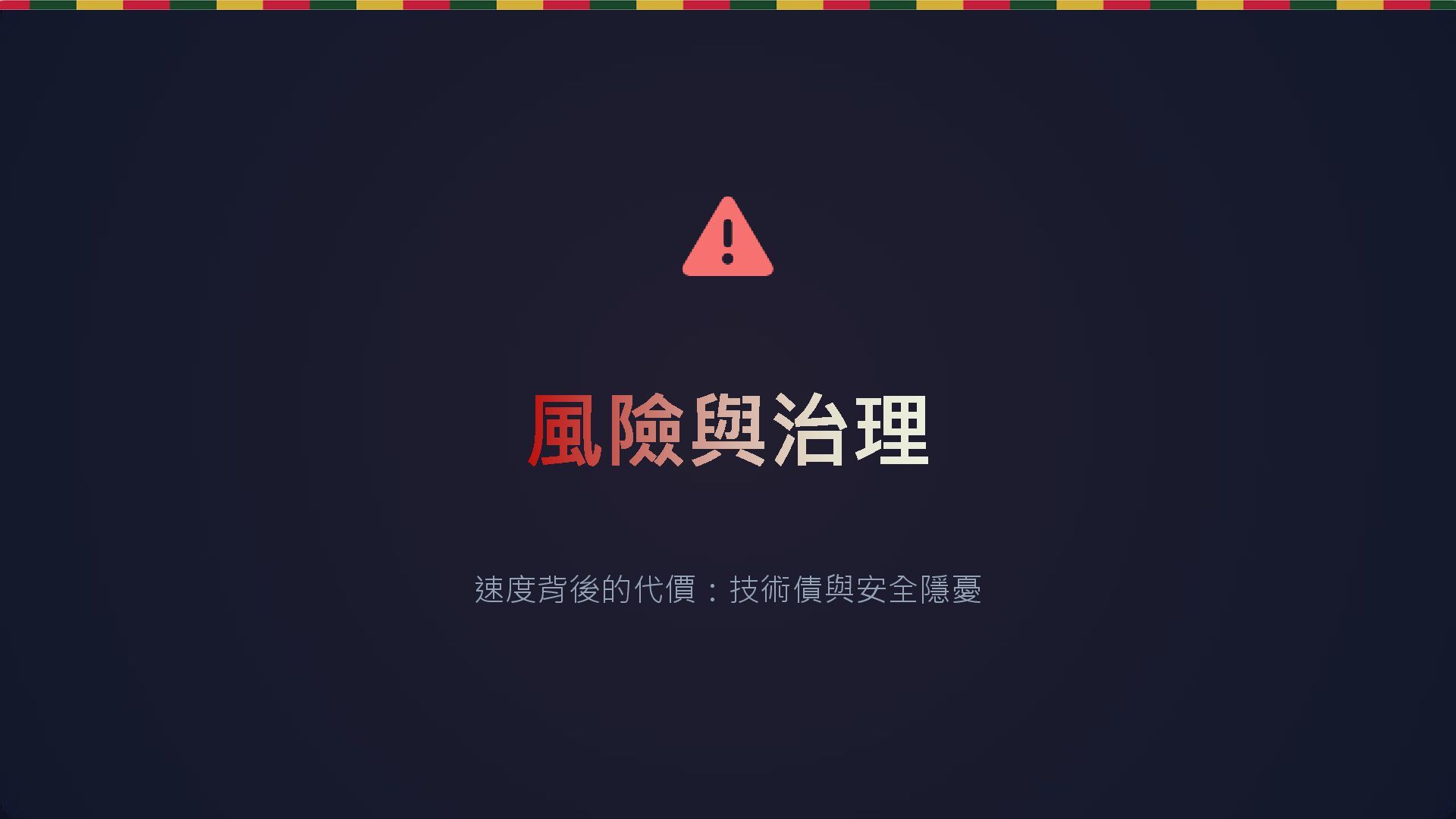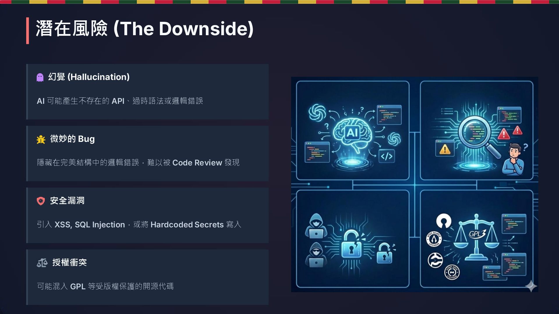 發現 安全漏洞 引入 XSS, SQL Injection,或將 Hardcoded Secrets 寫入 授權衝突 可能混入 GPL 等受版權保護的開源代碼 潛在風險 (The Downside)