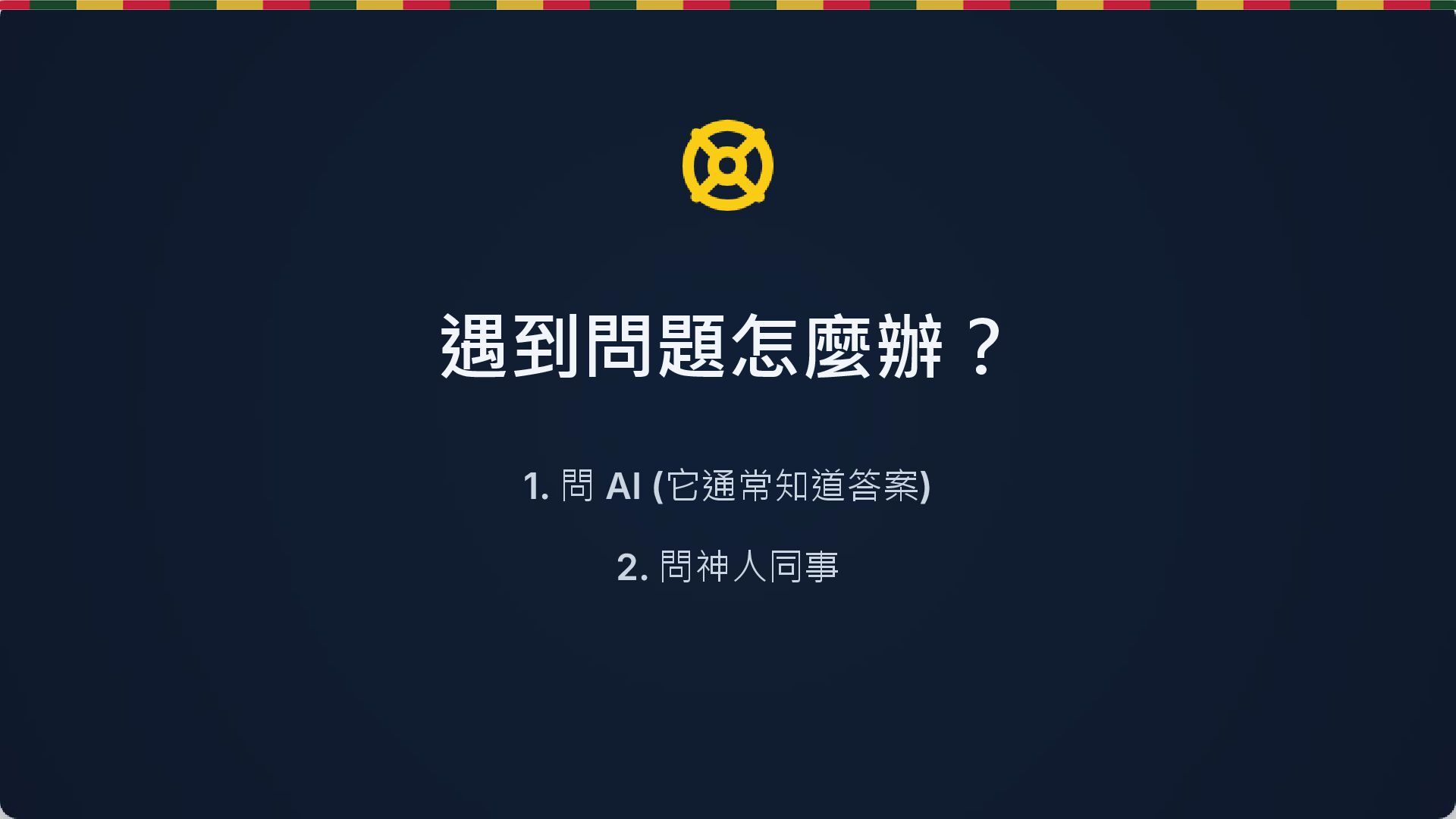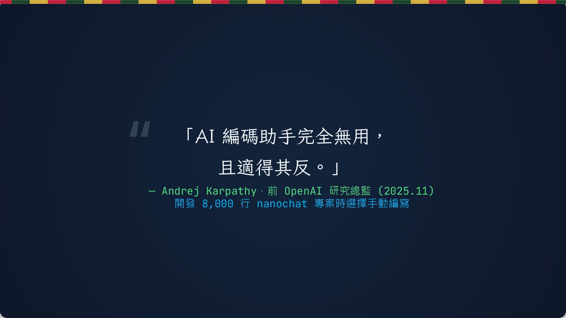 21. 擁抱變化,善用工具,但永遠保持清醒 "AI 生成的代碼看起來很完美,直到你需要維護它。" — Andrej Karpathy action_list.sh update --mindset "解決問題