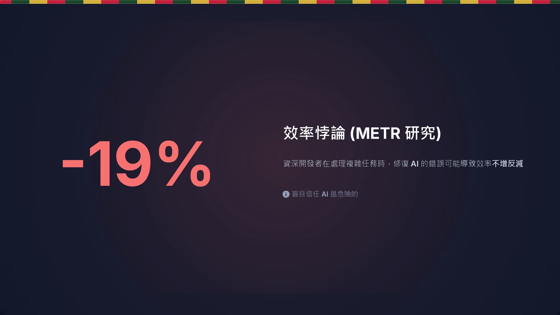 14. 幻覺 (Hallucination) AI 可能產生不存在的 API、過時語法或邏輯錯誤 微妙的 Bug 隱藏在完美結構中的邏輯錯誤,難以被 Code Review