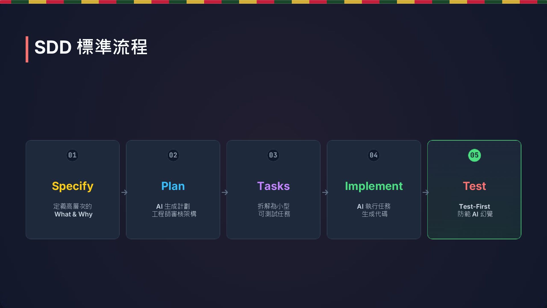 拆解為小型 可測試任務 Implement AI 執行任務 生成代碼 Test Test-First 防範 AI 幻覺 SDD 標準流程