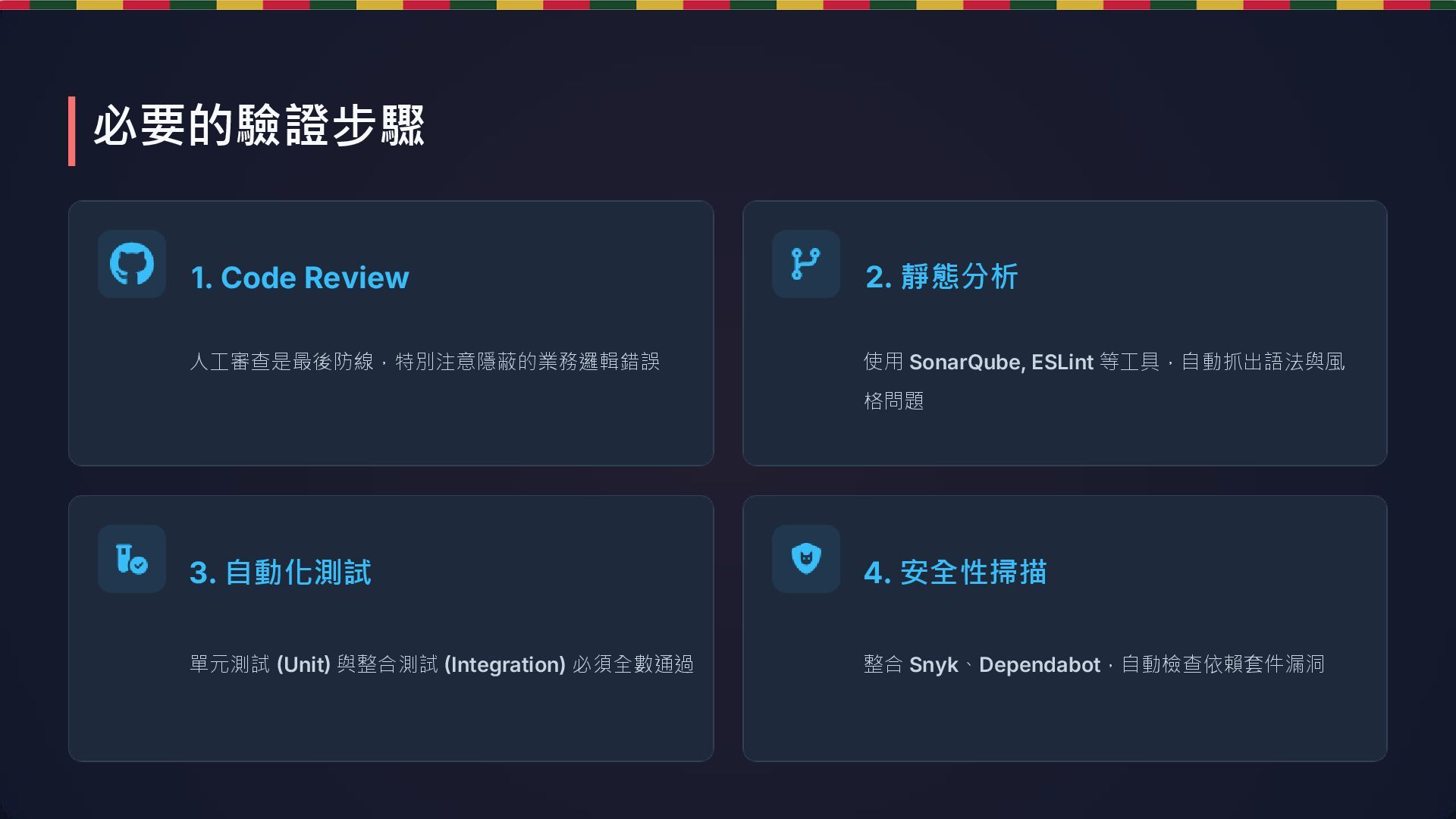 格問題 3. 自動化測試 單元測試 (Unit) 與整合測試 (Integration) 必須全數通過 4. 安全性掃描 整合 Snyk、Dependabot,自動檢查依賴套件漏洞 必要的驗證步驟