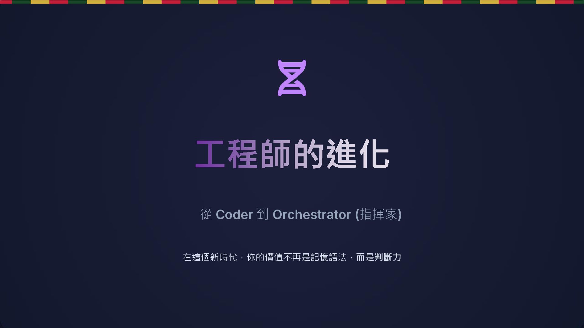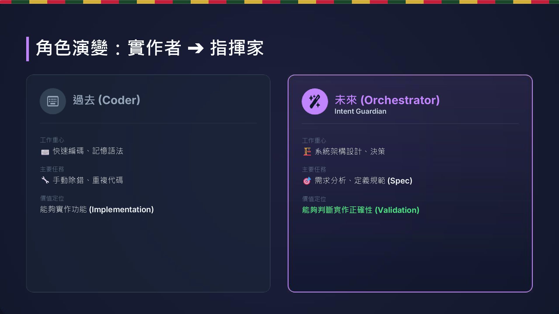 Guardian 工作重心 系統架構設計、決策 主要任務 需求分析、定義規範 (Spec) 價值定位 能夠判斷實作正確性 (Validation) 未來 (Orchestrator) 角色演變:實作者 ➔ 指揮家
