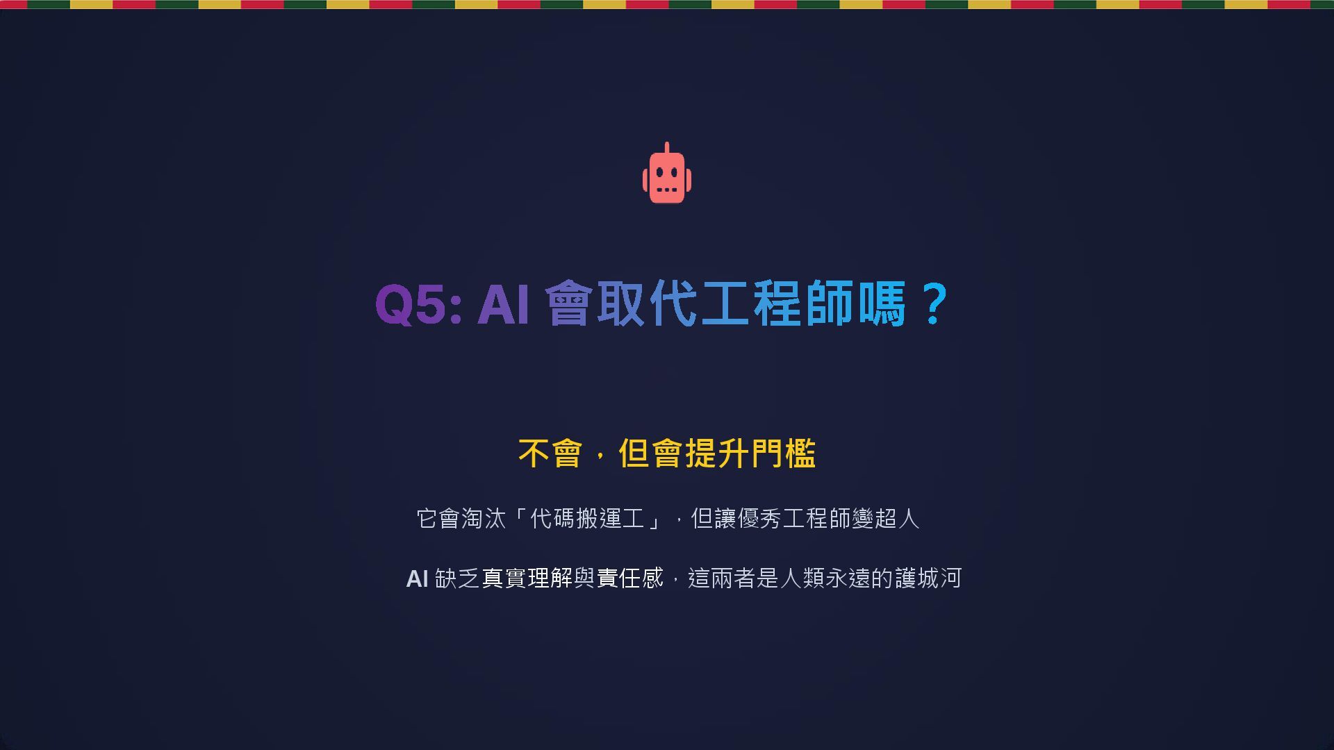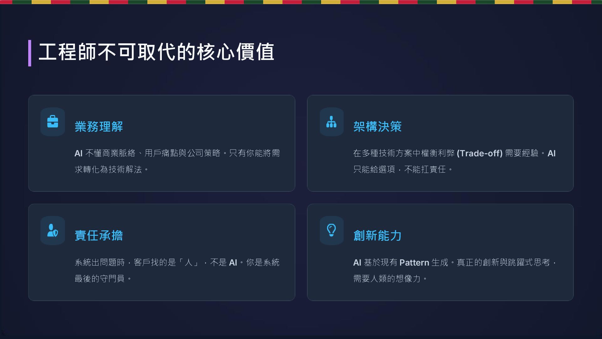 系統出問題時,客戶找的是「人」,不是 AI。你是系統 最後的守門員。 創新能力 AI 基於現有 Pattern 生成。真正的創新與跳躍式思考, 需要人類的想像力。 工程師不可取代的核心價值
