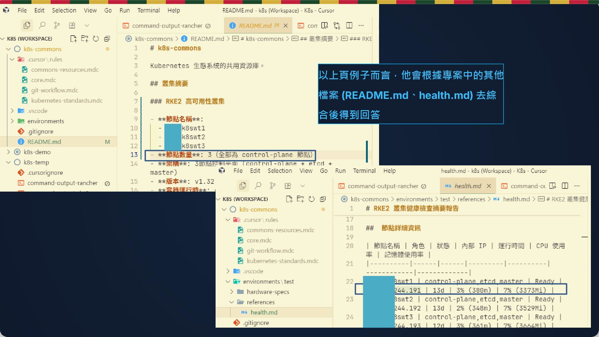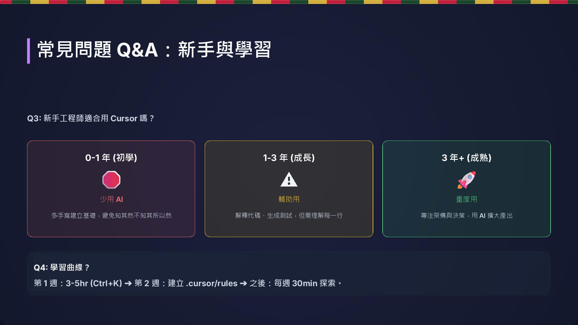 1-3 年 (成長) 輔助用 解釋代碼、生成測試,但需理解每一行 3 年+ (成熟) 重度用 專注架構與決策,用 AI 擴大產出 常見問題 Q&A:新手與學習 Q4: 學習曲線? 第 1 週:3-5hr (Ctrl+K) ➔ 第 2 週:建立 .cursor/rules ➔ 之後:每週 30min 探索。