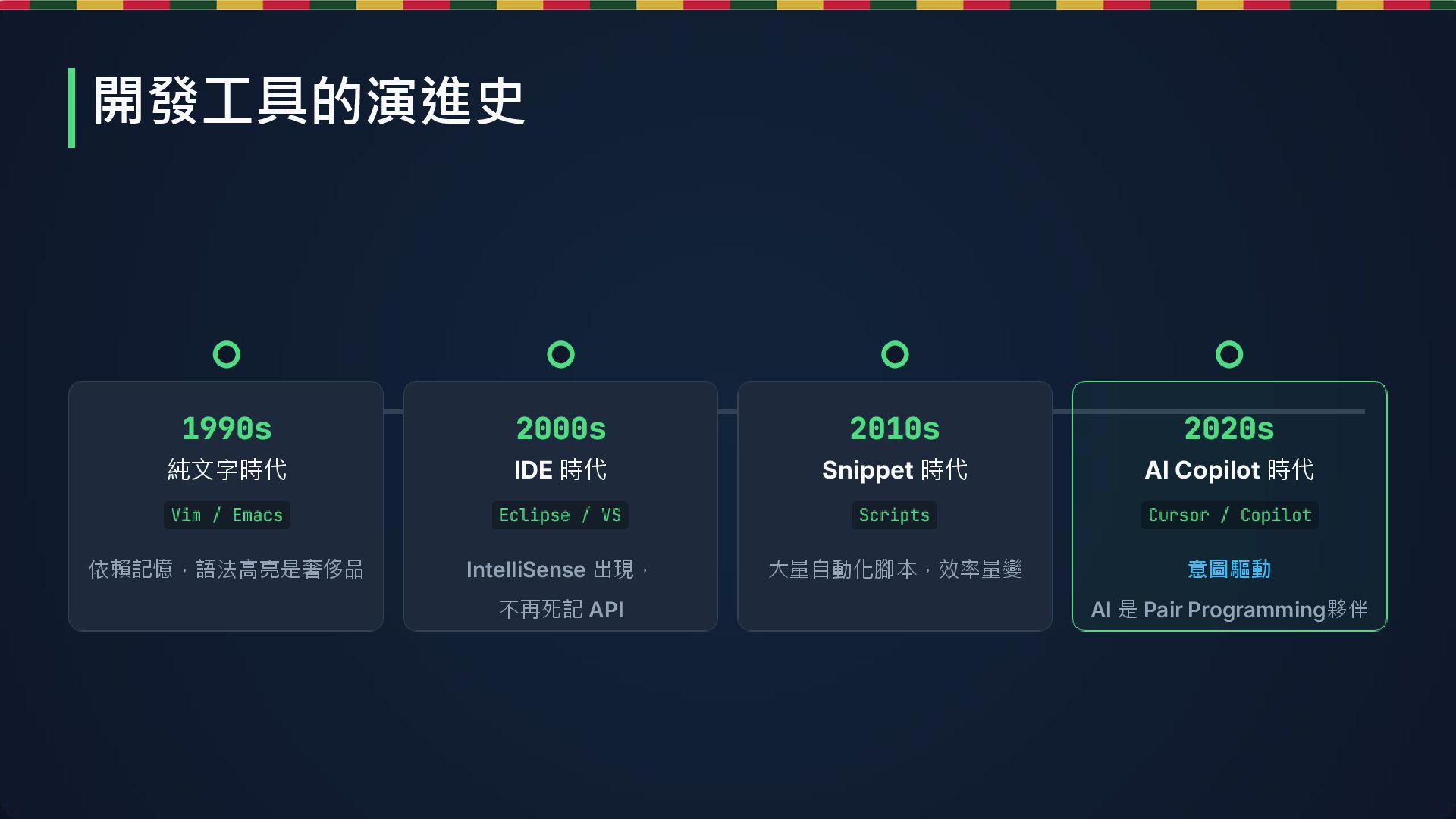 2010s Snippet 時代 大量自動化腳本,效率量變 AI Copilot 時代 意圖驅動 AI 是 Pair Programming夥伴 開發工具的演進史 2020s