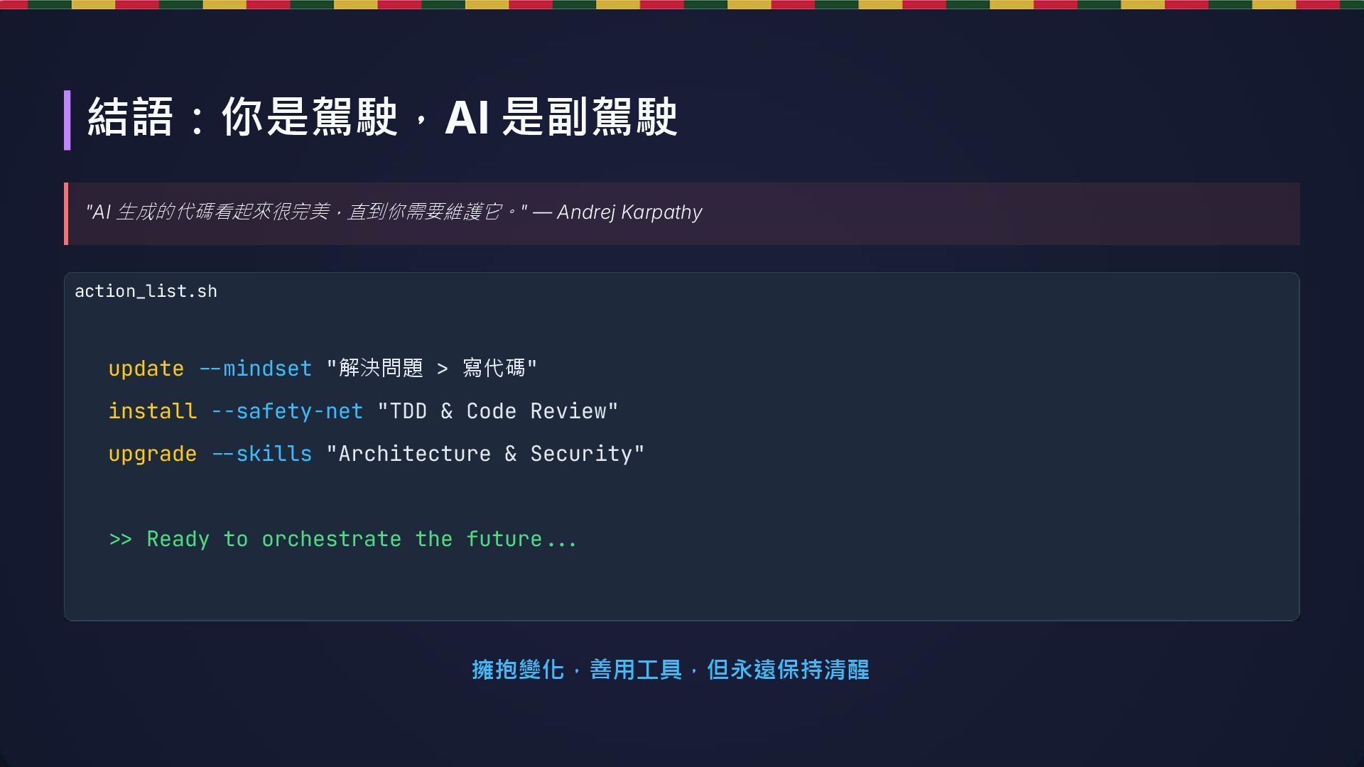 > 寫代碼" install --safety-net "TDD & Code Review" upgrade --skills "Architecture & Security" -> Ready to orchestrate the future--. 結語:你是駕駛,AI 是副駕駛
