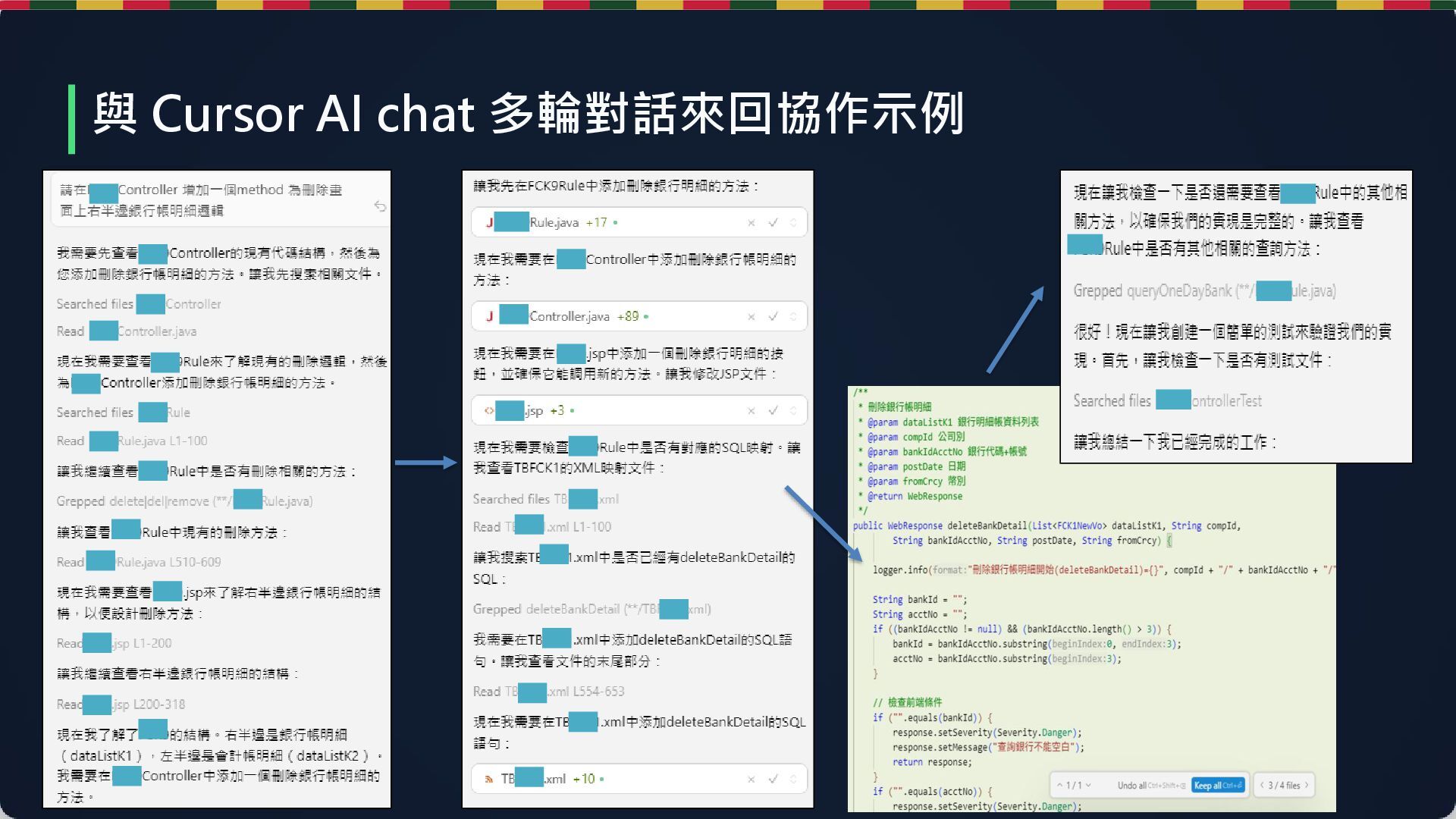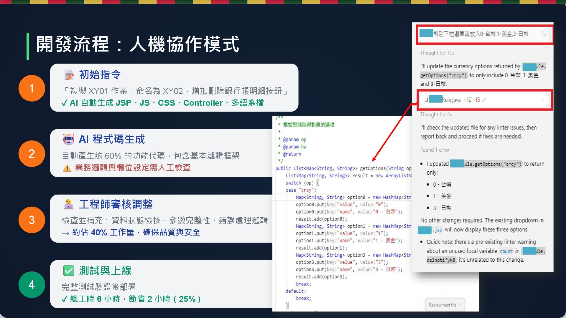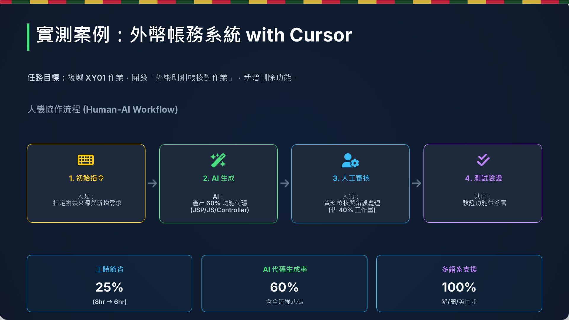 2. AI 生成 AI: 產出 60% 功能代碼 (JSP/JS/Controller) 3. 人工審核 人類: 資料檢核與錯誤處理 (佔 40% 工作量) 4. 測試驗證 共同: 驗證功能並部署 工時節省 25% (8hr ➔ 6hr) AI 代碼生成率 60% 含全端程式碼 多語系支援 100% 繁/簡/英同步 實測案例:外幣帳務系統 with Cursor