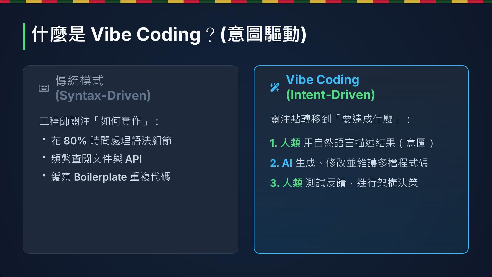 2. 傳統模式 (Syntax-Driven) 工程師關注「如何實作」: Vibe Coding (Intent-Driven) 關注點轉移到「要達成什麼」: • 花 80%