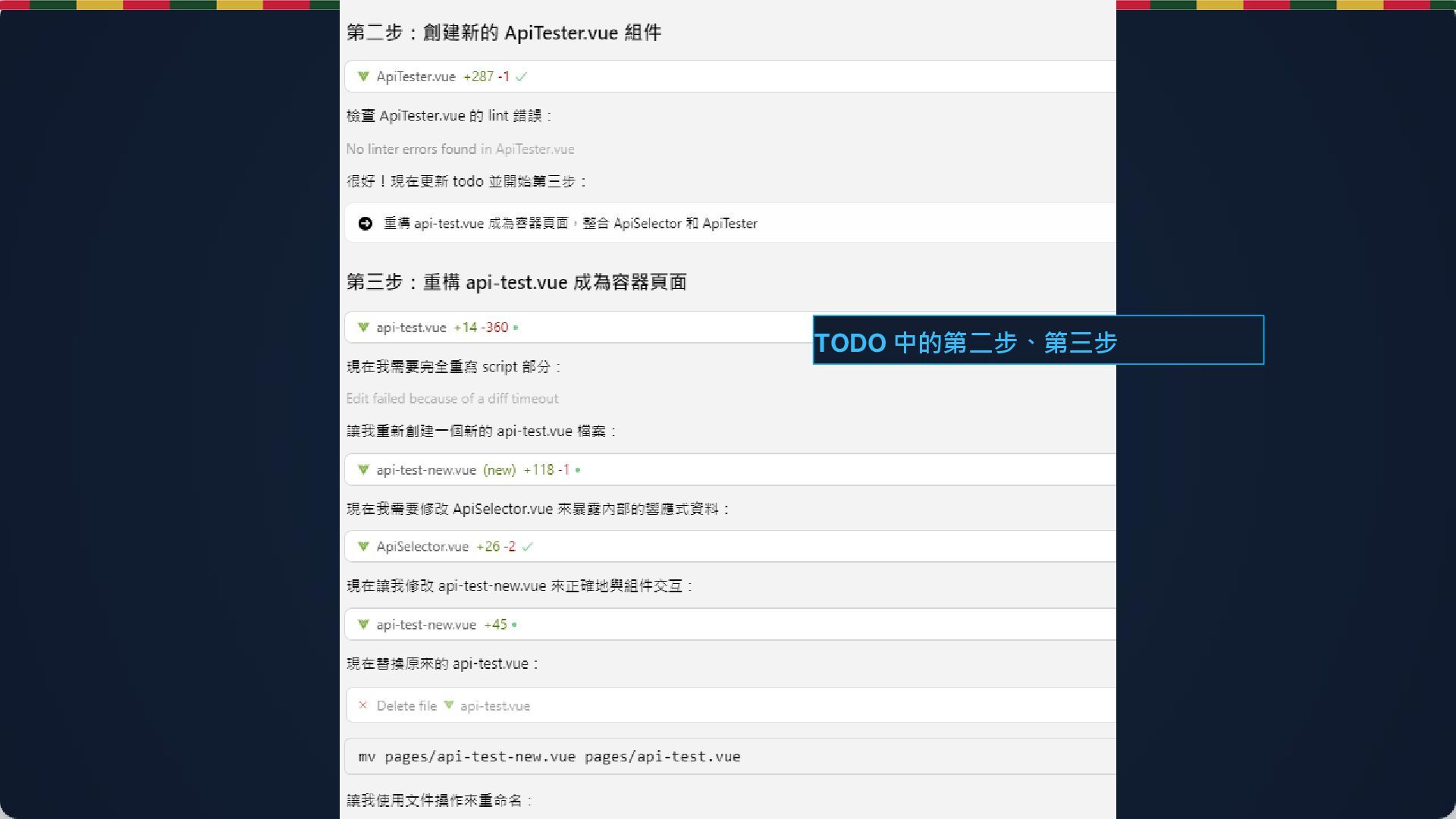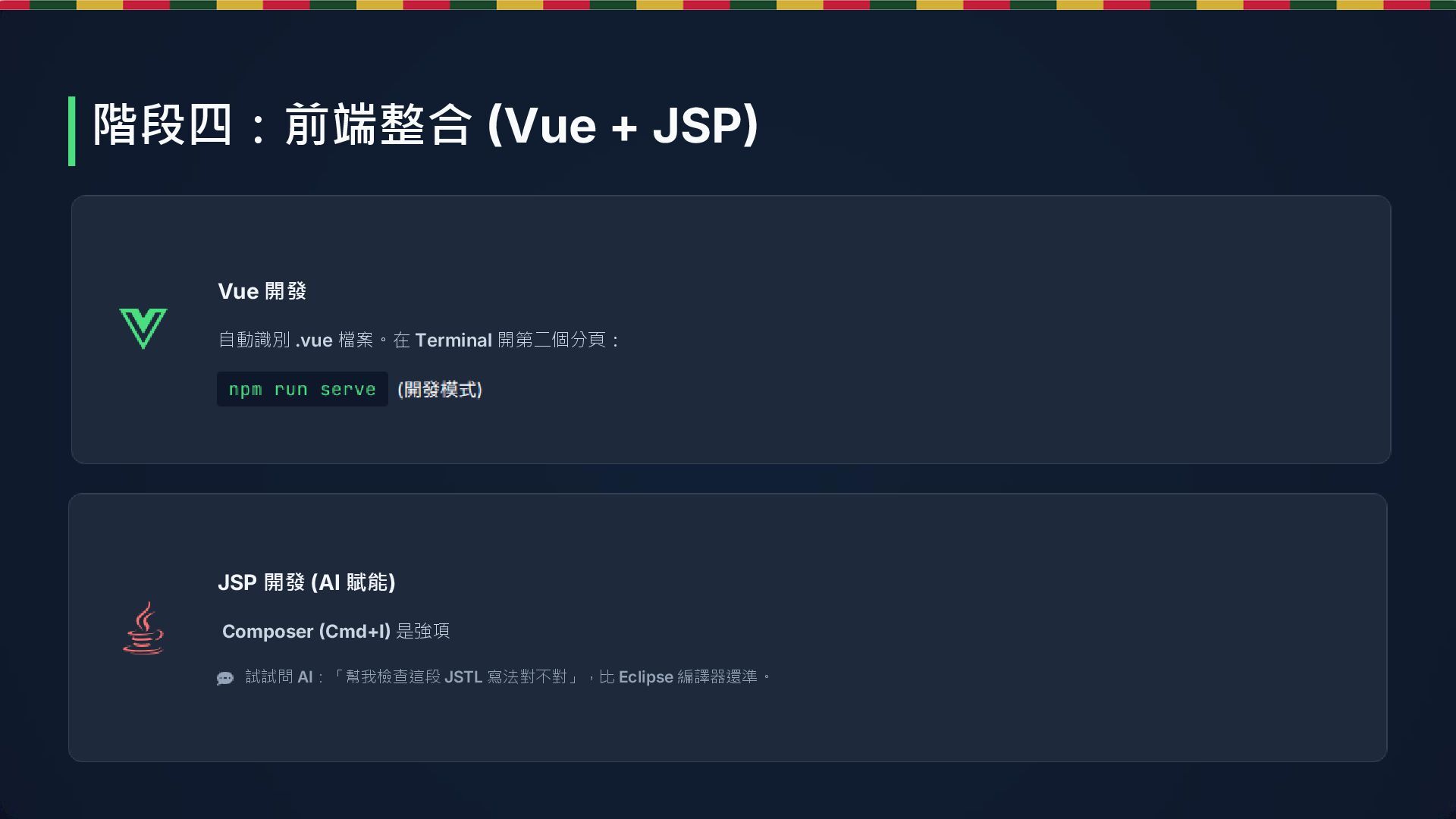 賦能) Composer (Cmd+I) 是強項 試試問 AI:「幫我檢查這段 JSTL 寫法對不對」,比 Eclipse 編譯器還準。 階段四:前端整合 (Vue + JSP)