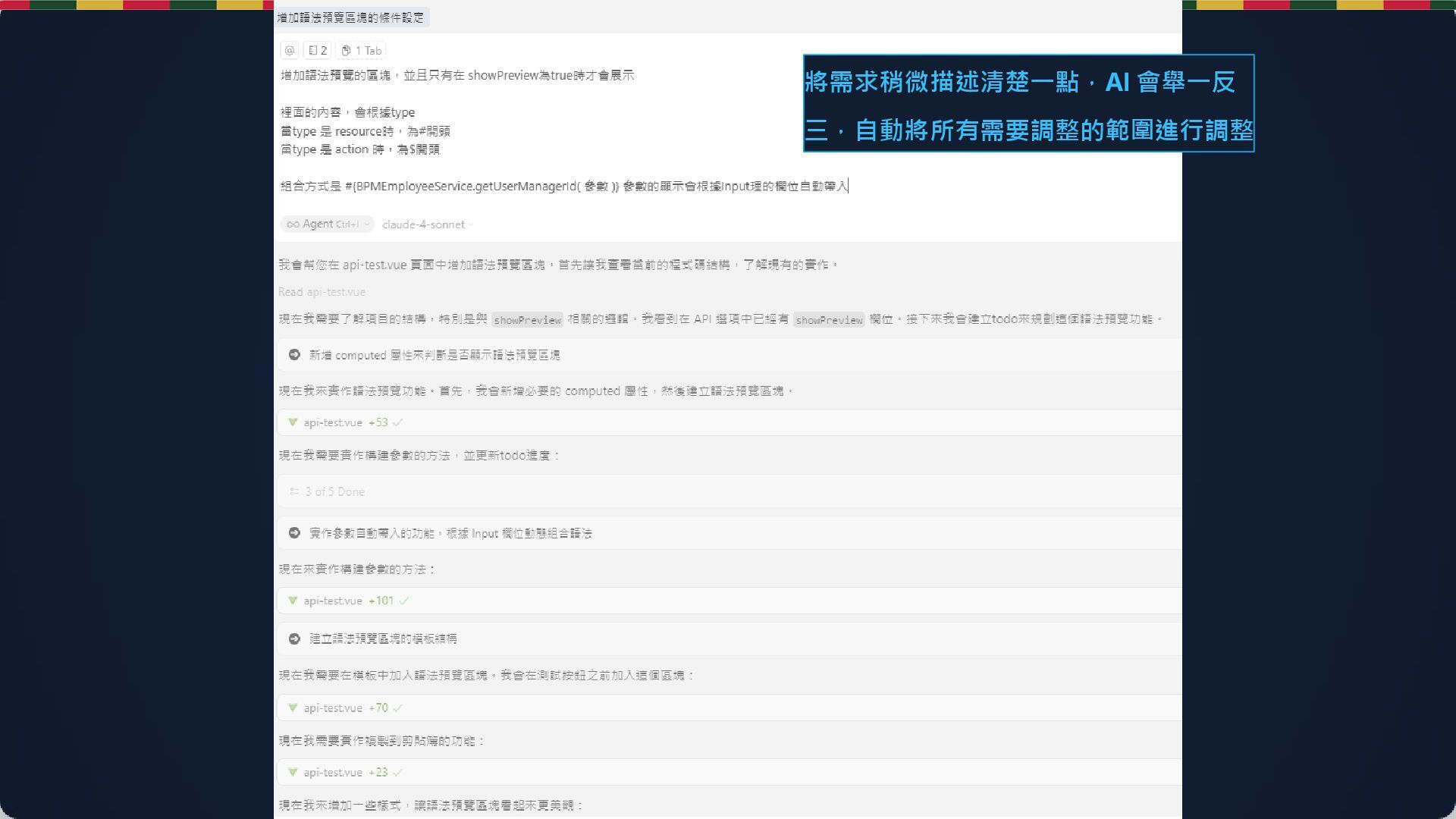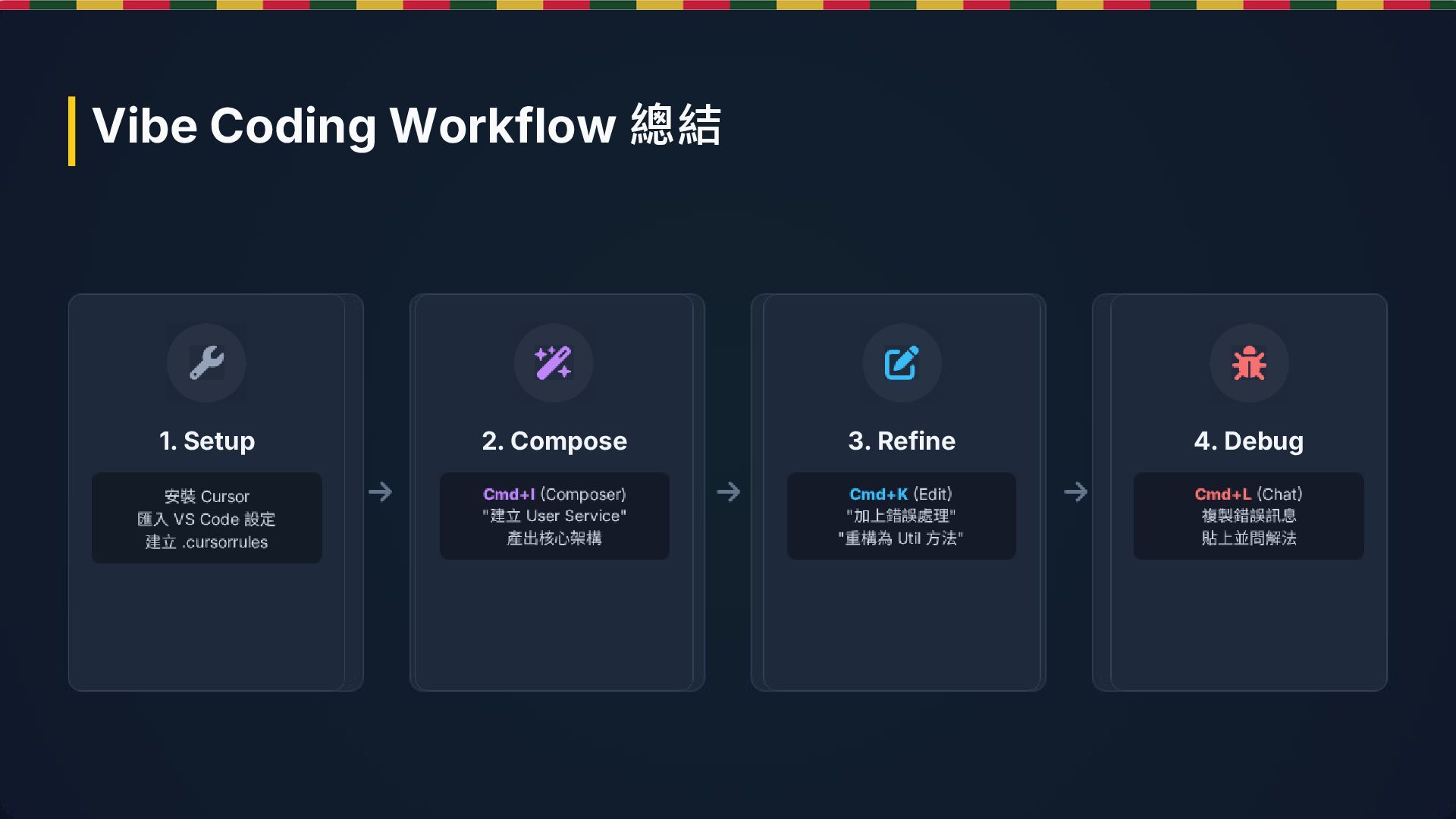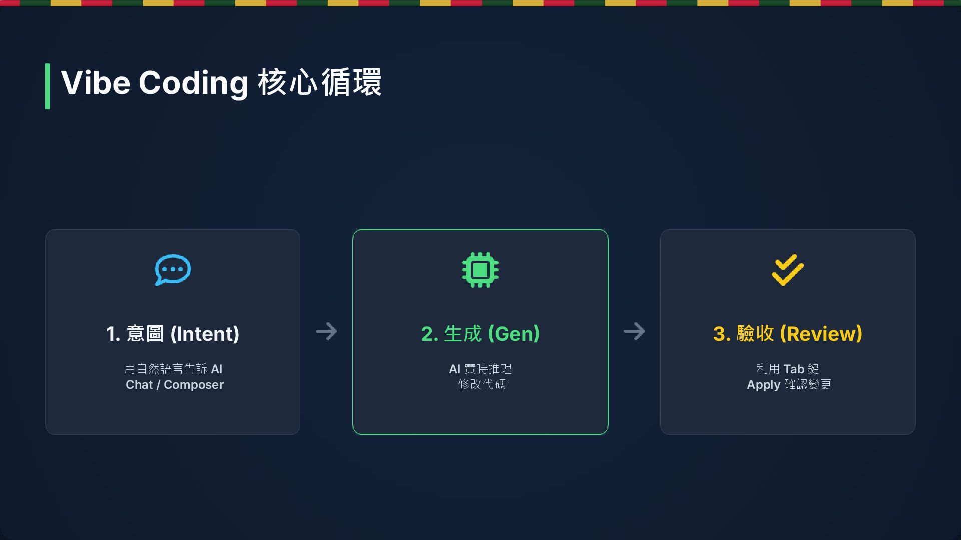 (Gen) AI 實時推理 修改代碼 3. 驗收 (Review) 利用 Tab 鍵 Apply 確認變更 Vibe Coding 核心循環