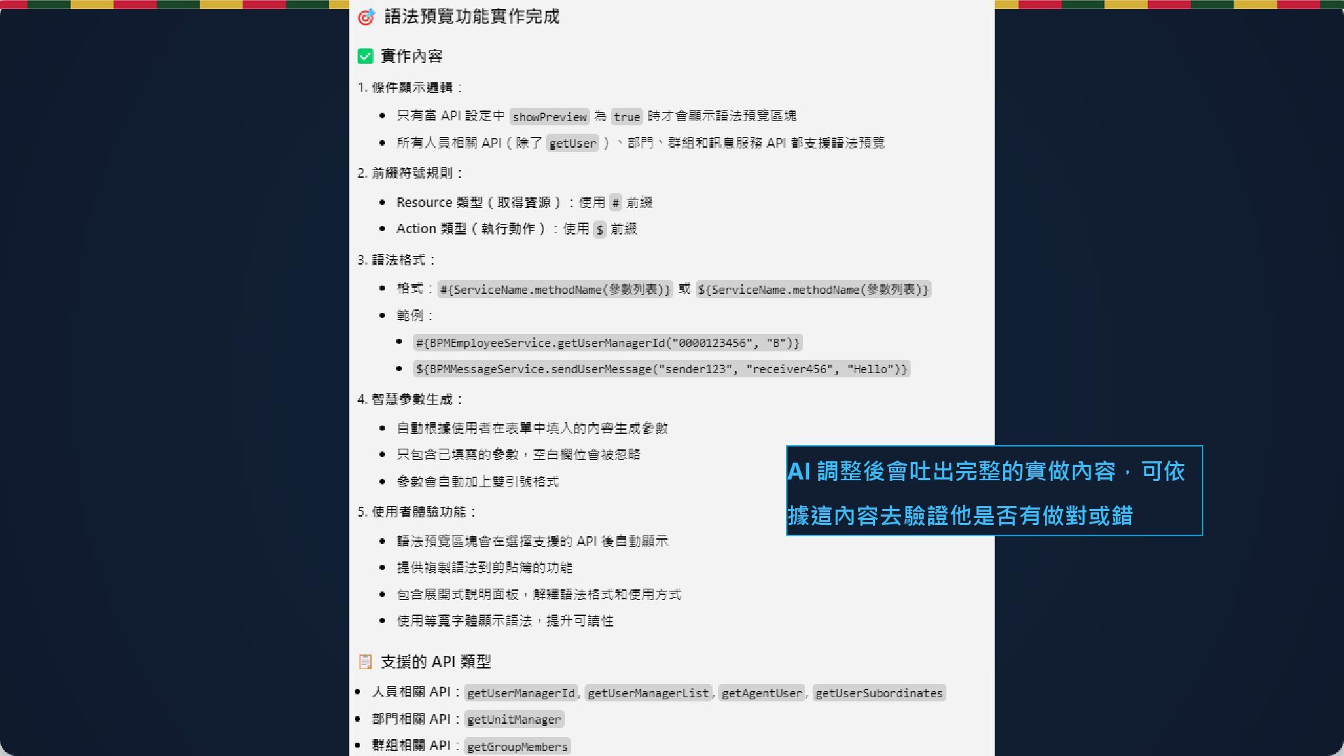 JSP、JS、CSS、Controller、多語系檔 2 AI 程式碼生成 自動產生約 60% 的功能代碼,包含基本邏輯框架 業務邏輯與欄位設定需人工檢查 3 工程師審核調整 檢查並補充:資料狀態檢核、參數完整性、錯誤處理邏輯 → 約佔 40% 工作量,確保品質與安全 4 測試與上線 完整測試驗證後部署 ✓ 總工時 6 小時,節省 2 小時(25%)
