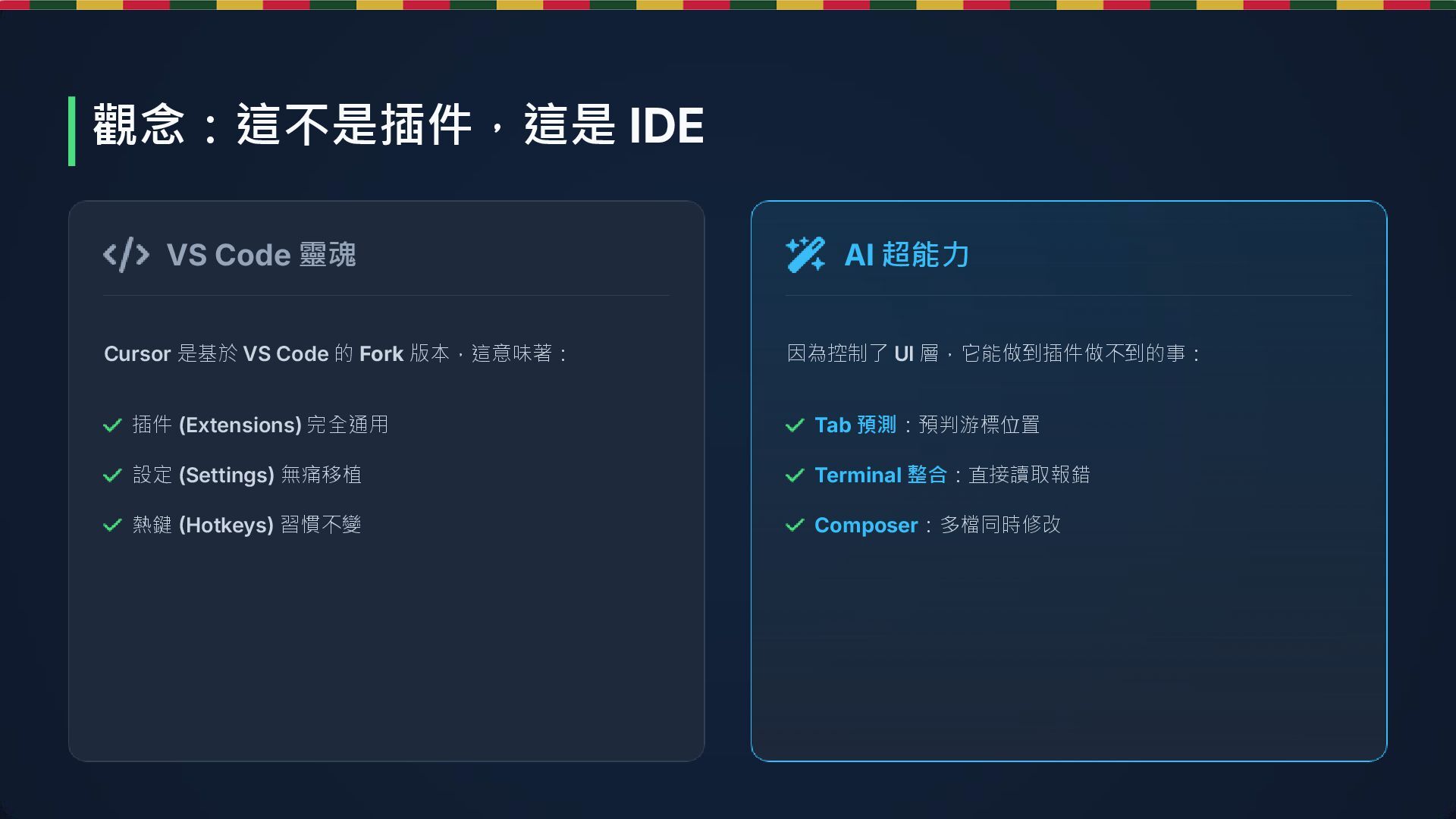 VS Code 靈魂 插件 (Extensions) 完全通用 設定 (Settings) 無痛移植 熱鍵 (Hotkeys) 習慣不變 AI 超能力 Tab 預測:預判游標位置 Terminal 整合:直接讀取報錯 Composer:多檔同時修改 觀念:這不是插件,這是 IDE