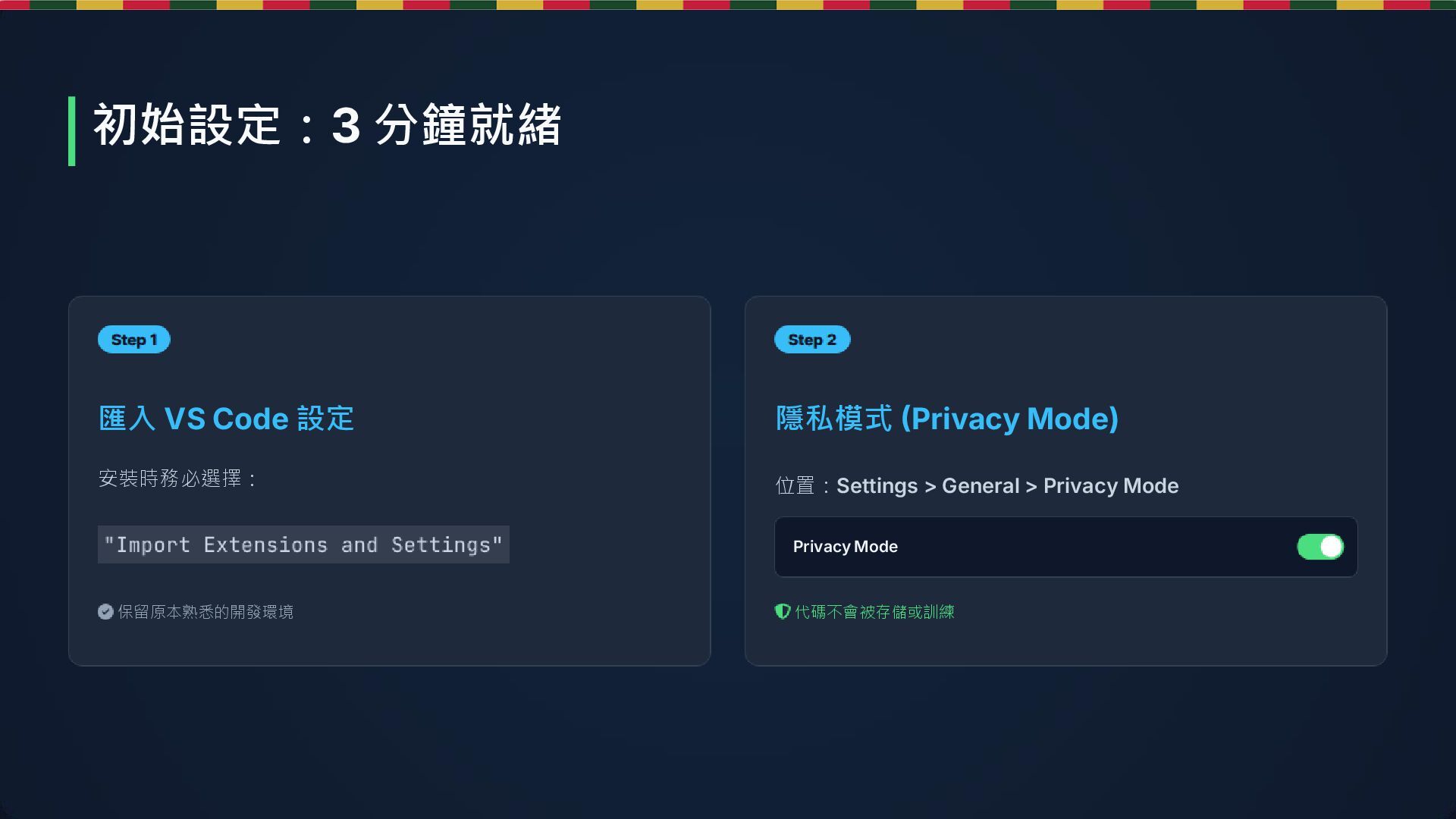 27. 匯入 VS Code 設定 安裝時務必選擇: 保留原本熟悉的開發環境 隱私模式 (Privacy Mode) 位置:Settings