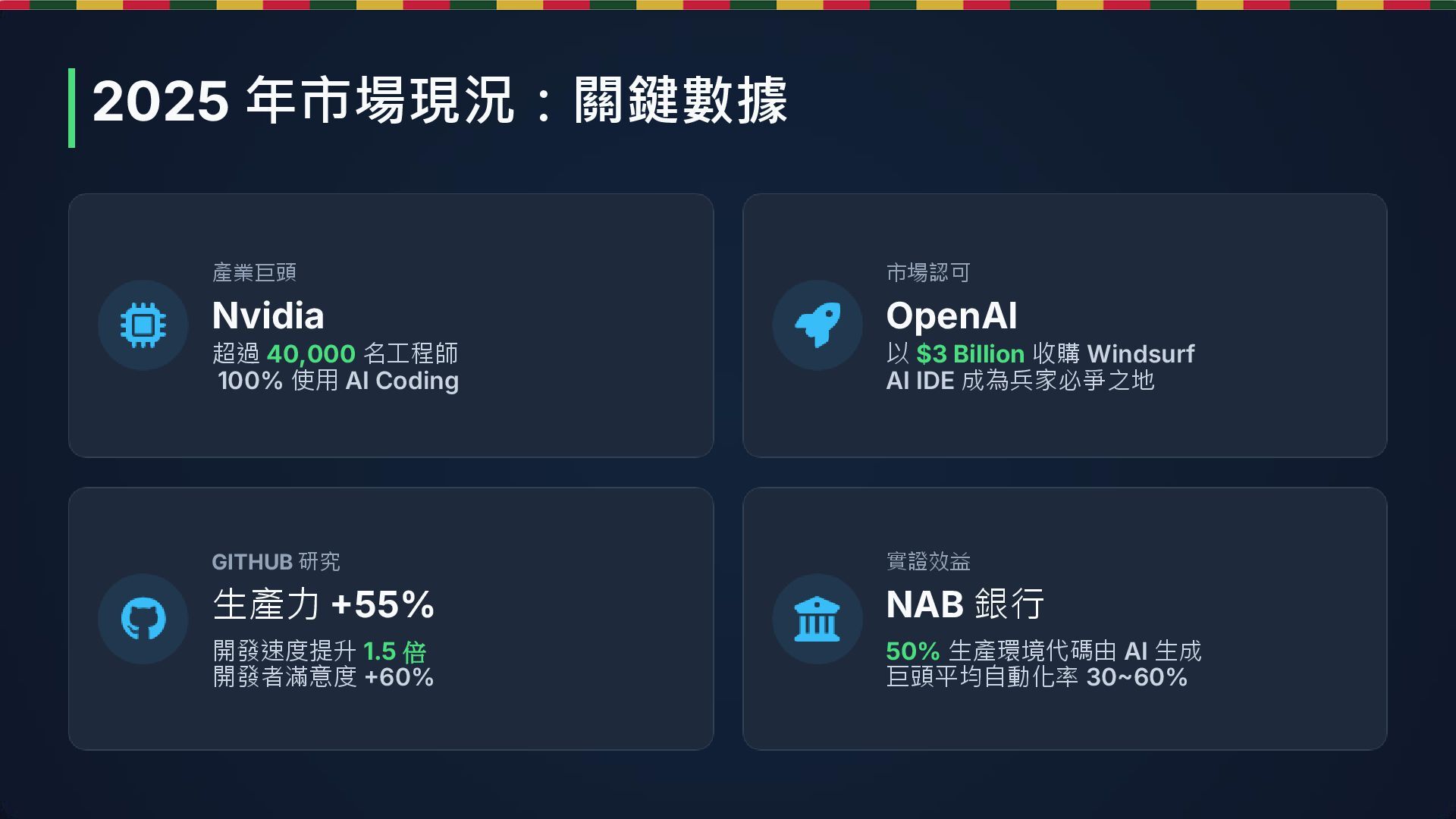 OpenAI 以 $3 Billion 收購 Windsurf AI IDE 成為兵家必爭之地 GITHUB 研究 生產力 +55% 開發速度提升 1.5 倍 開發者滿意度 +60% 實證效益 NAB 銀行 50% 生產環境代碼由 AI 生成 巨頭平均自動化率 30~60% 2025 年市場現況:關鍵數據