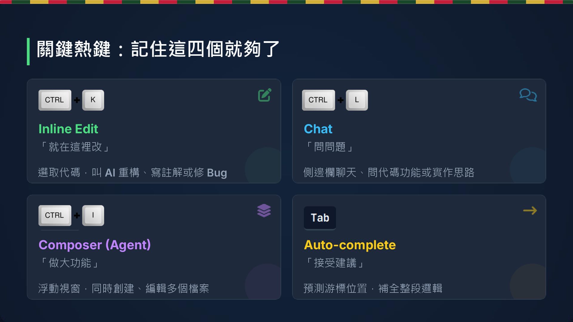 Composer (Agent) 「做大功能」 浮動視窗,同時創建、編輯多個檔案 Auto-complete 「接受建議」 預測游標位置,補全整段邏輯 關鍵熱鍵:記住這四個就夠了