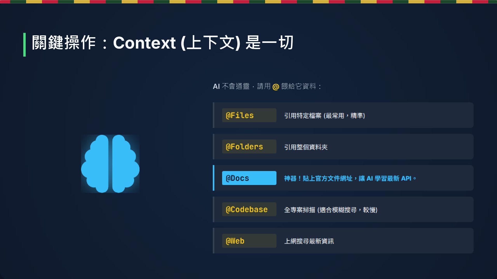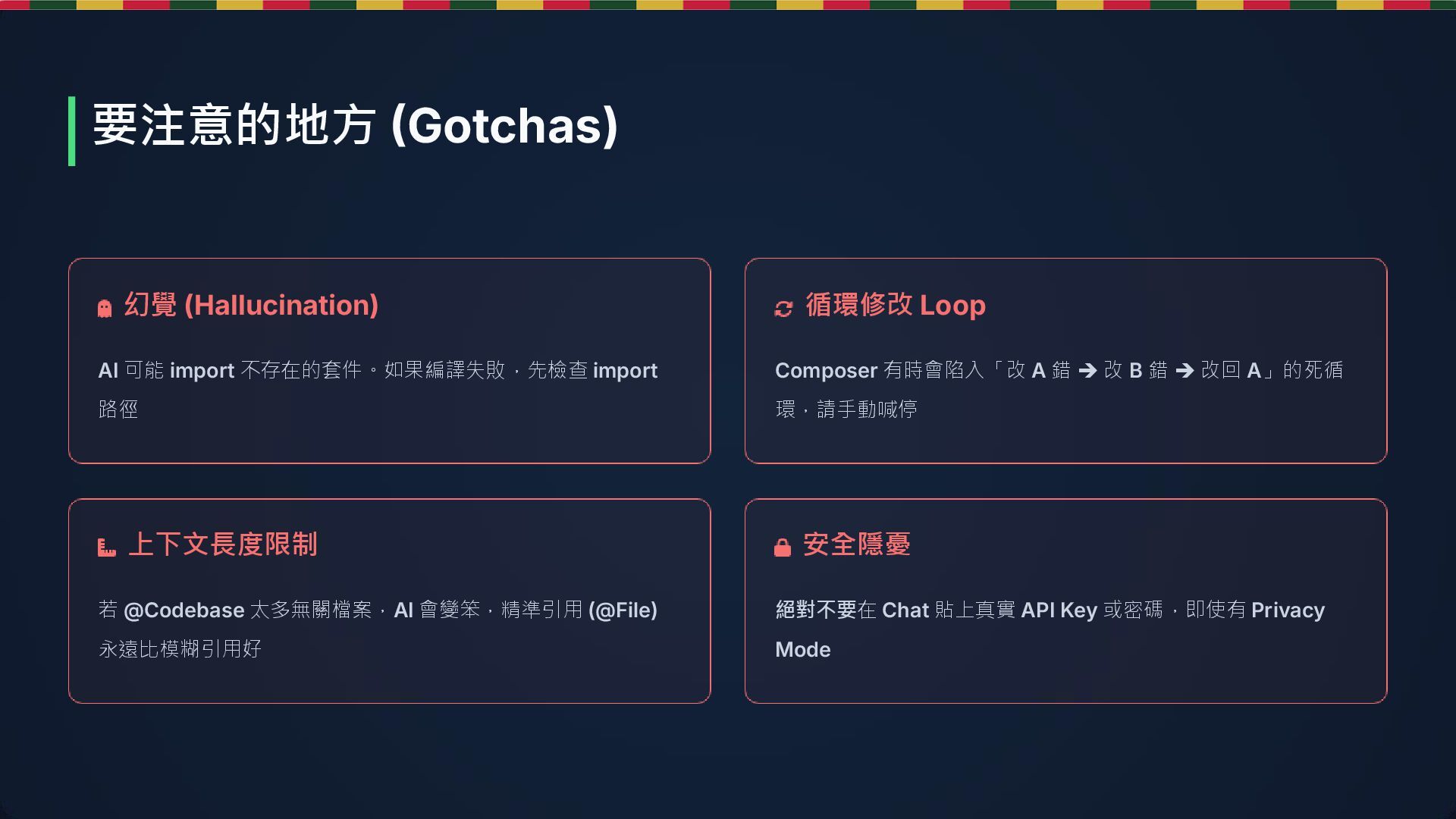 ➔ 改 B 錯 ➔ 改回 A」的死循 環,請手動喊停 若 @Codebase 太多無關檔案,AI 會變笨,精準引用 (@File) 永遠比模糊引用好 絕對不要在 Chat 貼上真實 API Key 或密碼,即使有 Privacy Mode 幻覺 (Hallucination) 循環修改 Loop 上下文長度限制 安全隱憂 要注意的地方 (Gotchas)