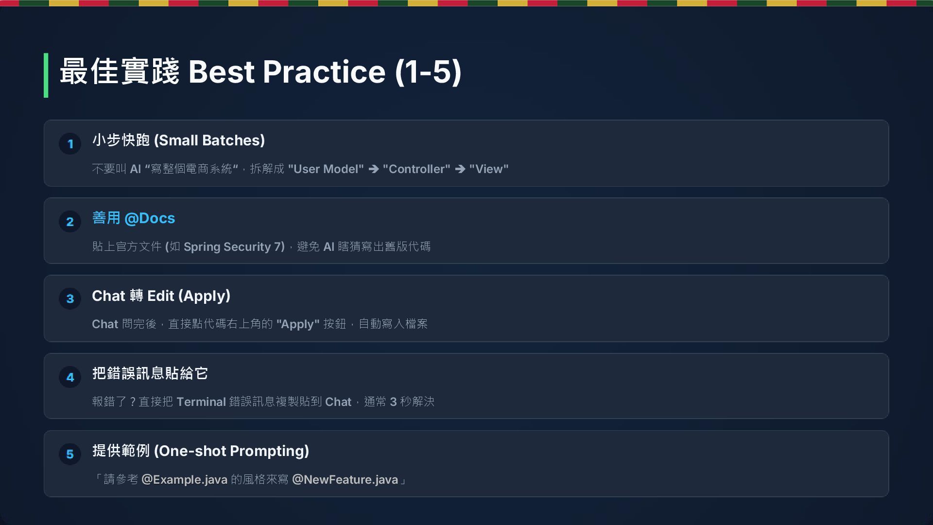 ➔ "View" 善用 @Docs 貼上官方文件 (如 Spring Security 7),避免 AI 瞎猜寫出舊版代碼 Chat 轉 Edit (Apply) Chat 問完後,直接點代碼右上角的 "Apply" 按鈕,自動寫入檔案 把錯誤訊息貼給它 報錯了?直接把 Terminal 錯誤訊息複製貼到 Chat,通常 3 秒解決 提供範例 (One-shot Prompting) 「請參考 @Example.java 的風格來寫 @NewFeature.java」 最佳實踐 Best Practice (1-5)