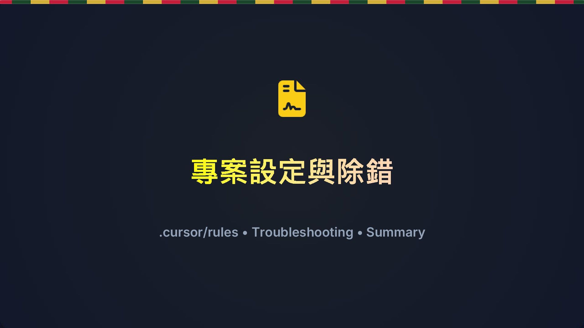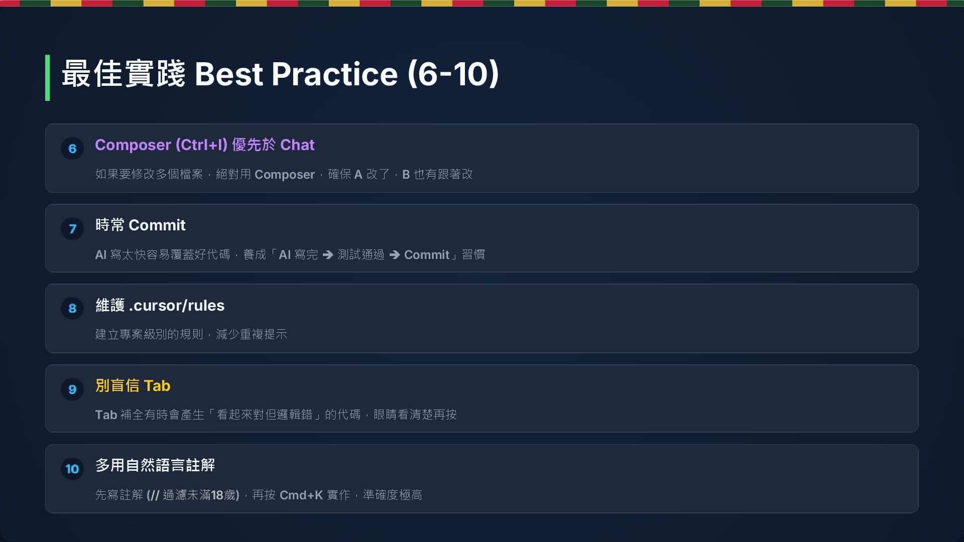 Commit AI 寫太快容易覆蓋好代碼,養成「AI 寫完 ➔ 測試通過 ➔ Commit」習慣 維護 .cursor/rules 建立專案級別的規則,減少重複提示 別盲信 Tab Tab 補全有時會產生「看起來對但邏輯錯」的代碼,眼睛看清楚再按 多用自然語言註解 先寫註解 (// 過濾未滿18歲),再按 Cmd+K 實作,準確度極高 最佳實踐 Best Practice (6-10)