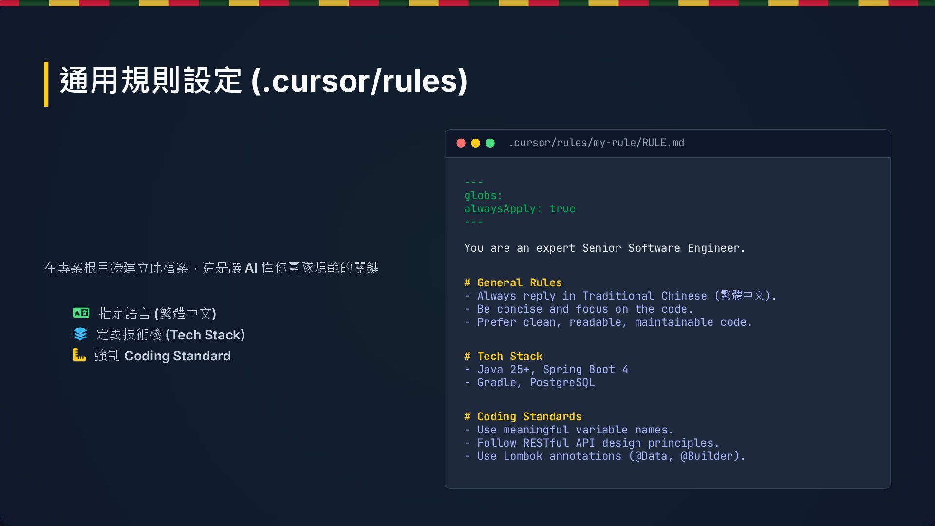 an expert Senior Software Engineer. # General Rules - Always reply in Traditional Chinese (繁體中文). - Be concise and focus on the code. - Prefer clean, readable, maintainable code. # Tech Stack - Java 25+, Spring Boot 4 - Gradle, PostgreSQL # Coding Standards - Use meaningful variable names. - Follow RESTful API design principles. - Use Lombok annotations (@Data, @Builder). 指定語言 (繁體中文) 定義技術棧 (Tech Stack) 強制 Coding Standard .cursor/rules/my-rule/RULE.md 通用規則設定 (.cursor/rules)