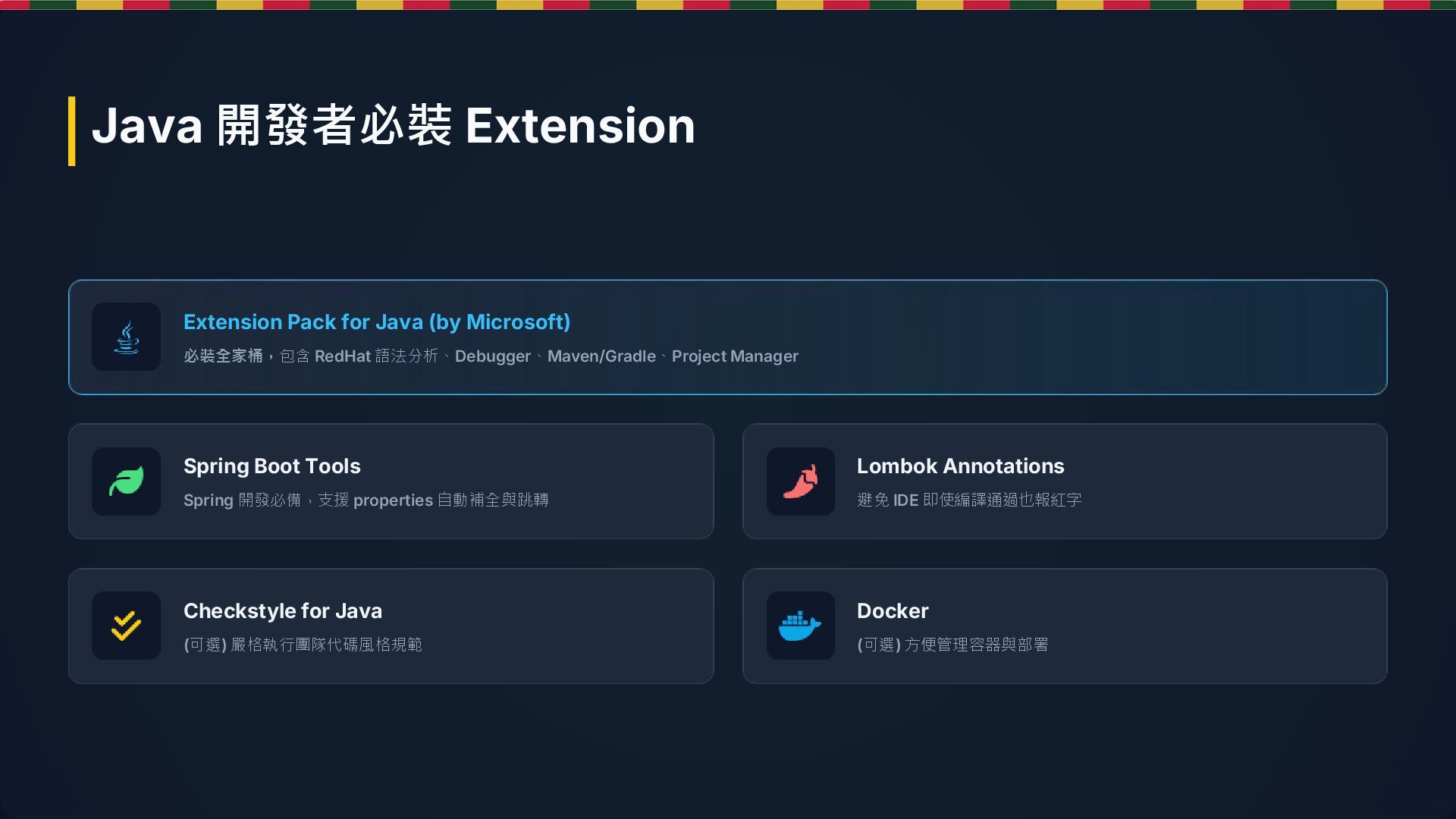 Spring Boot Tools Spring 開發必備,支援 properties 自動補全與跳轉 Lombok Annotations 避免 IDE 即使編譯通過也報紅字 Checkstyle for Java (可選) 嚴格執行團隊代碼風格規範 Docker (可選) 方便管理容器與部署 Java 開發者必裝 Extension