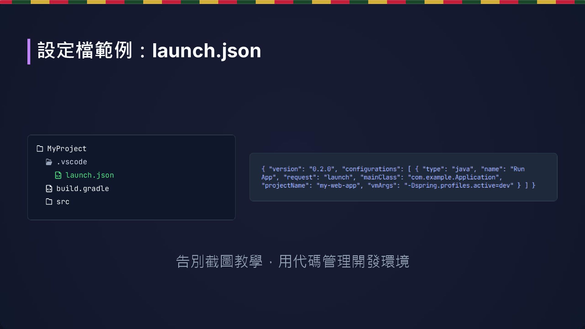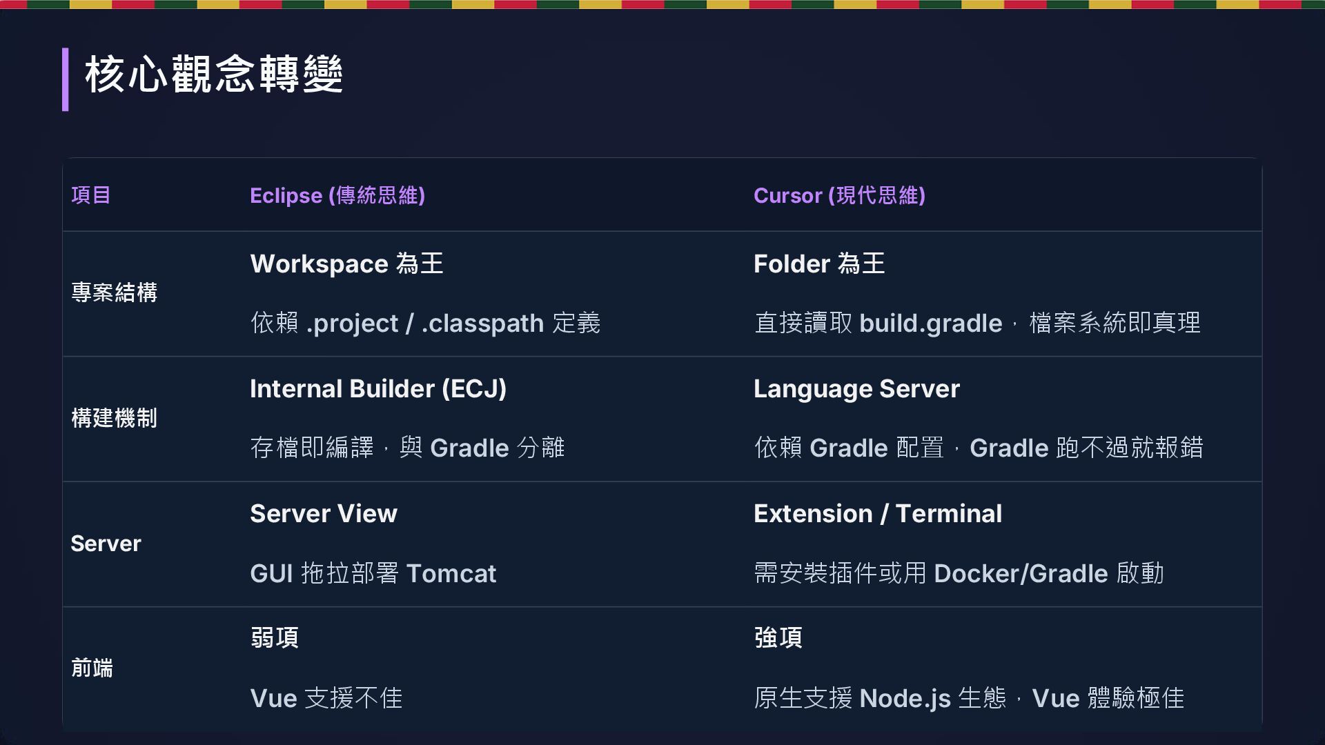 / .classpath 定義 Folder 為王 直接讀取 build.gradle,檔案系統即真理 構建機制 Internal Builder (ECJ) 存檔即編譯,與 Gradle 分離 Language Server 依賴 Gradle 配置,Gradle 跑不過就報錯 Server Server View GUI 拖拉部署 Tomcat Extension / Terminal 需安裝插件或用 Docker/Gradle 啟動 前端 弱項 Vue 支援不佳 強項 原生支援 Node.js 生態,Vue 體驗極佳 核心觀念轉變