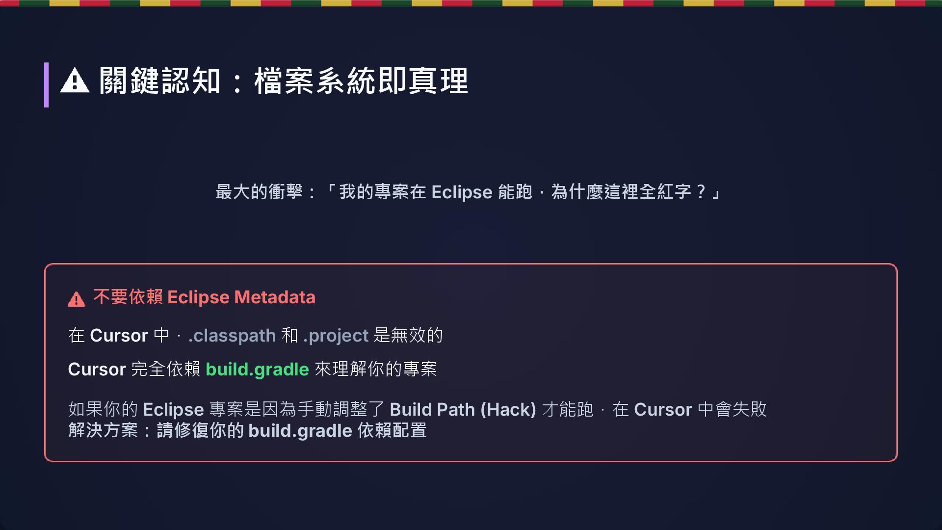 完全依賴 build.gradle 來理解你的專案 如果你的 Eclipse 專案是因為手動調整了 Build Path (Hack) 才能跑,在 Cursor 中會失敗 解決方案:請修復你的 build.gradle 依賴配置 不要依賴 Eclipse Metadata 關鍵認知:檔案系統即真理