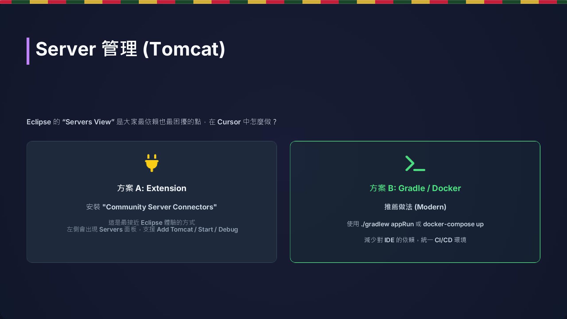 安裝 "Community Server Connectors" 這是最接近 Eclipse 體驗的方式 左側會出現 Servers 面板,支援 Add Tomcat / Start / Debug 方案 B: Gradle / Docker 推薦做法 (Modern) 使用 ./gradlew appRun 或 docker-compose up 減少對 IDE 的依賴,統一 CI/CD 環境 Server 管理 (Tomcat)