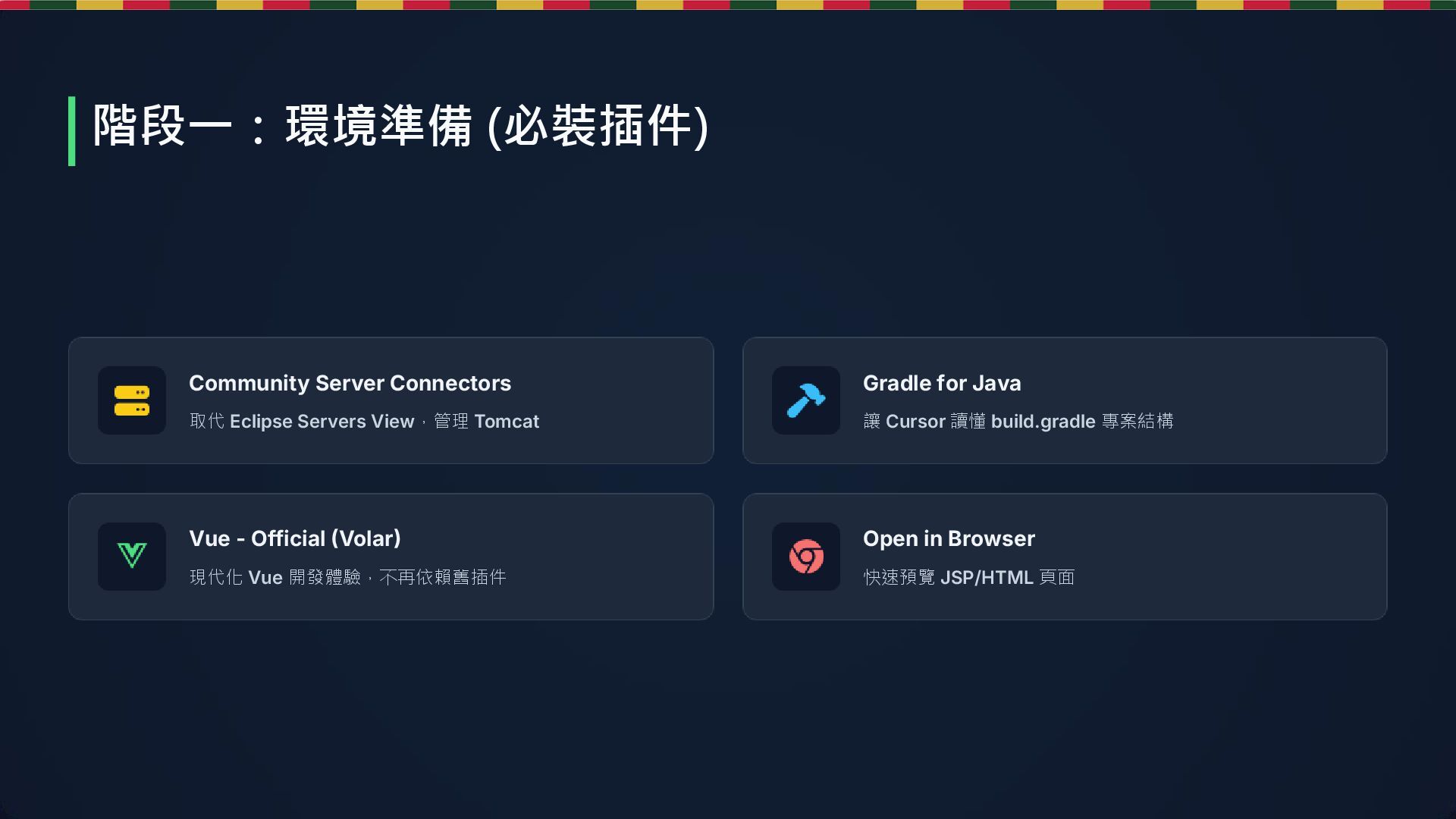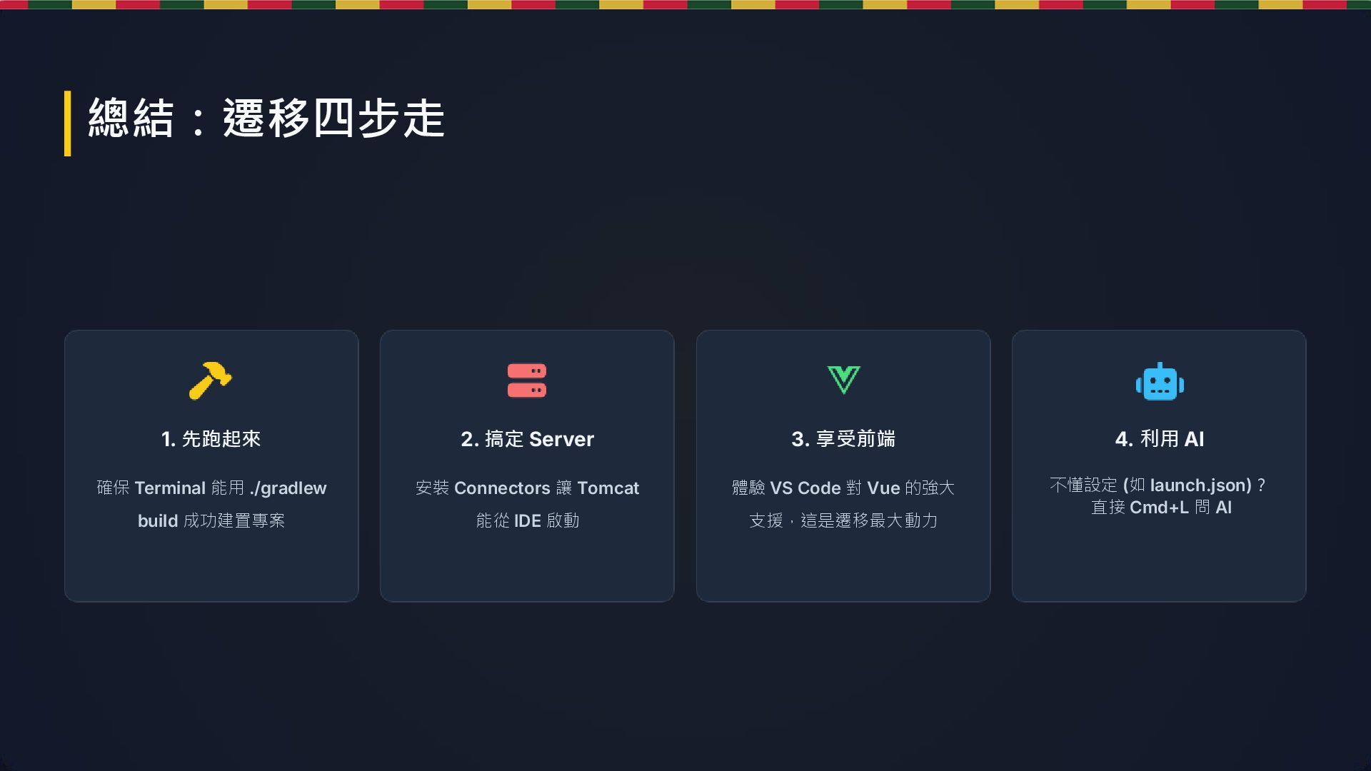 Server 安裝 Connectors 讓 Tomcat 能從 IDE 啟動 3. 享受前端 體驗 VS Code 對 Vue 的強大 支援,這是遷移最大動力 4. 利用 AI 不懂設定 (如 launch.json)? 直接 Cmd+L 問 AI 總結:遷移四步走