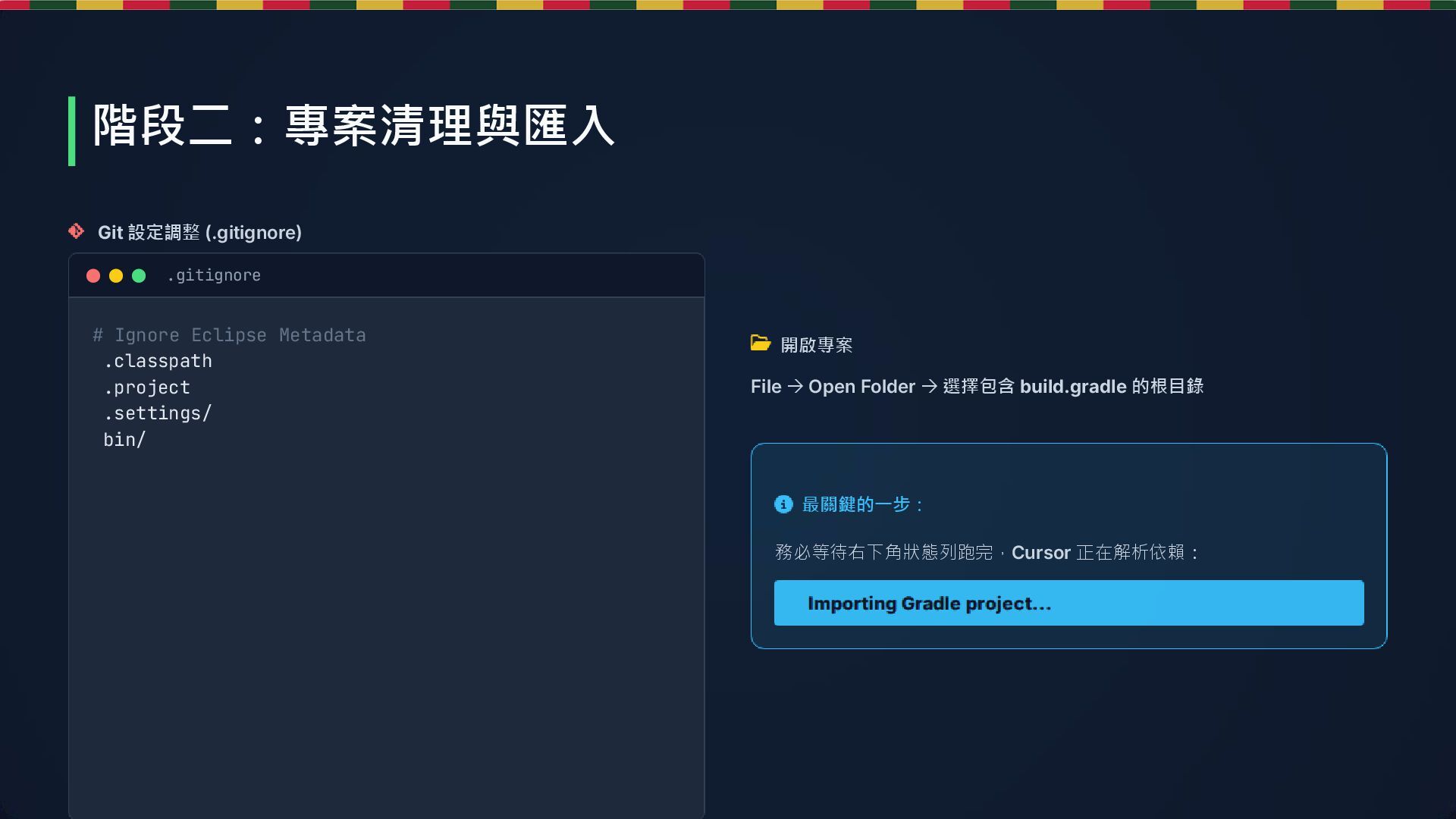 bin/ 開啟專案 File → Open Folder → 選擇包含 build.gradle 的根目錄 最關鍵的一步: 務必等待右下角狀態列跑完,Cursor 正在解析依賴: .gitignore 階段二:專案清理與匯入
