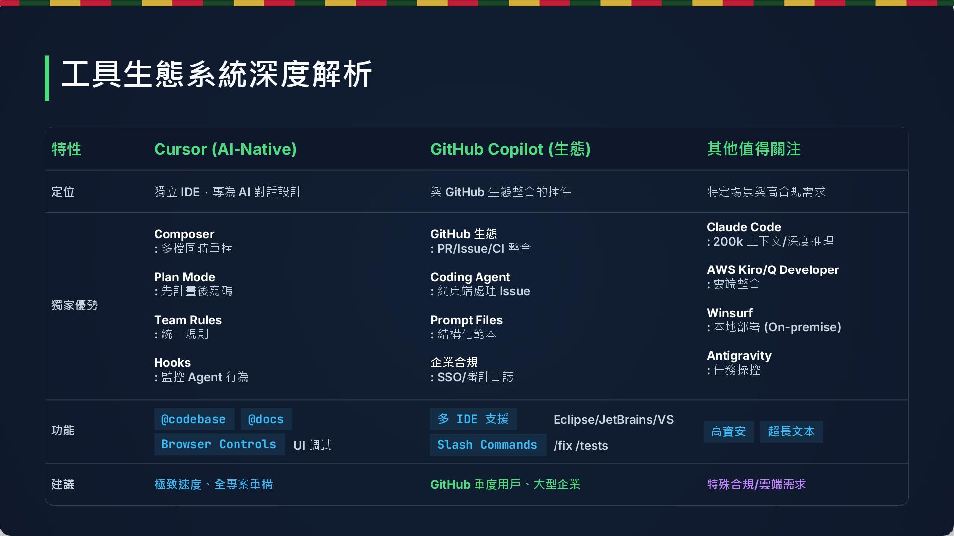AI 對話設計 與 GitHub 生態整合的插件 特定場景與高合規需求 獨家優勢 Composer : 多檔同時重構 Plan Mode : 先計畫後寫碼 Team Rules : 統一規則 Hooks : 監控 Agent 行為 GitHub 生態 : PR/Issue/CI 整合 Coding Agent : 網頁端處理 Issue Prompt Files : 結構化範本 企業合規 : SSO/審計日誌 Claude Code : 200k 上下文/深度推理 AWS Kiro/Q Developer : 雲端整合 Winsurf : 本地部署 (On-premise) Antigravity : 任務操控 功能 建議 極致速度、全專案重構 GitHub 重度用戶、大型企業 特殊合規/雲端需求 工具生態系統深度解析 @codebase @docs Browser Controls UI 調試 多 IDE 支援 Eclipse/JetBrains/VS /fix /tests Slash Commands 高資安 超長文本