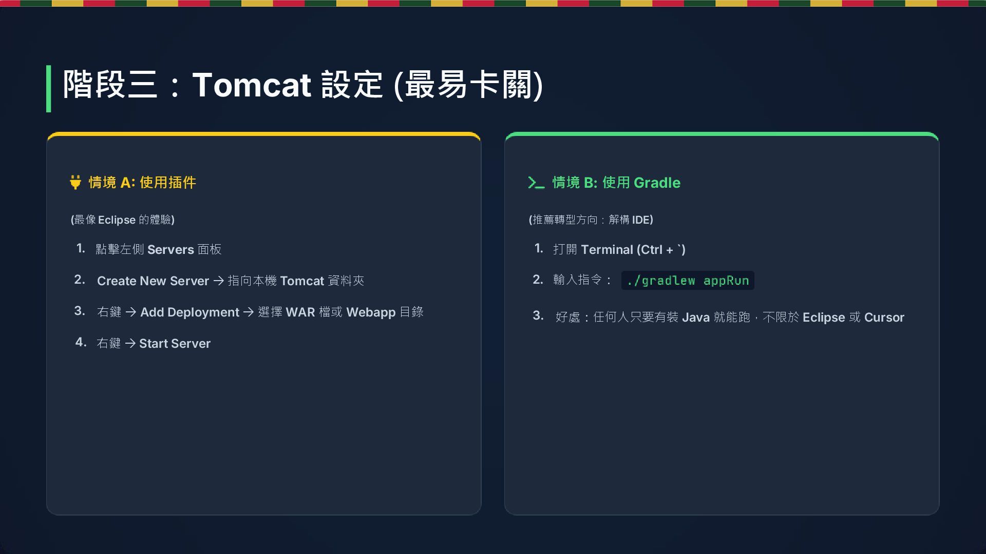 (推薦轉型方向:解構 IDE) 1. 點擊左側 Servers 面板 2. Create New Server → 指向本機 Tomcat 資料夾 3. 右鍵 → Add Deployment → 選擇 WAR 檔或 Webapp 目錄 4. 右鍵 → Start Server 1. 打開 Terminal (Ctrl + `) 2. 輸入指令: 3. 好處:任何人只要有裝 Java 就能跑,不限於 Eclipse 或 Cursor 階段三:Tomcat 設定 (最易卡關)