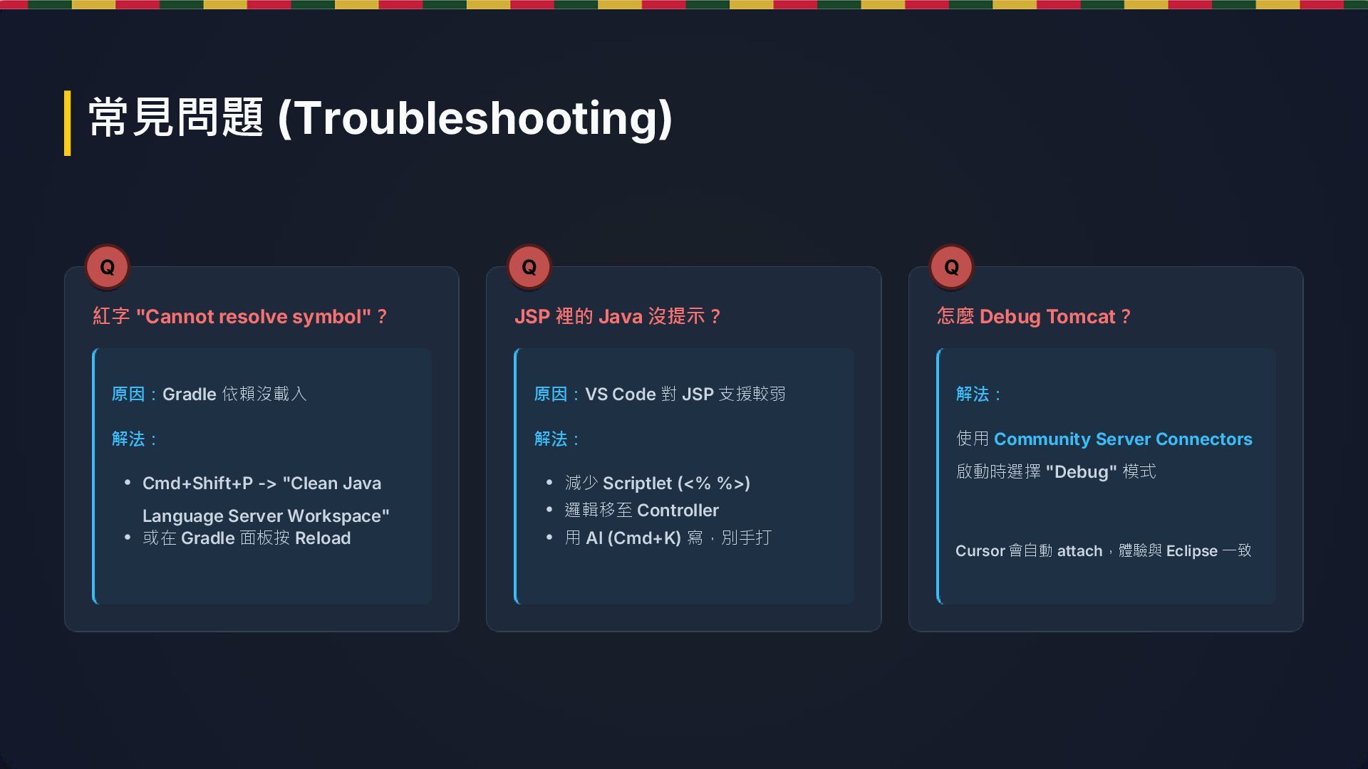 Tomcat? 原因:Gradle 依賴沒載入 解法: 原因:VS Code 對 JSP 支援較弱 解法: 解法: 使用 Community Server Connectors 啟動時選擇 "Debug" 模式 Cursor 會自動 attach,體驗與 Eclipse 一致 • Cmd+Shift+P -> "Clean Java Language Server Workspace" • 或在 Gradle 面板按 Reload • 減少 Scriptlet (<% %>) • 邏輯移至 Controller • 用 AI (Cmd+K) 寫,別手打 常見問題 (Troubleshooting) Q Q Q