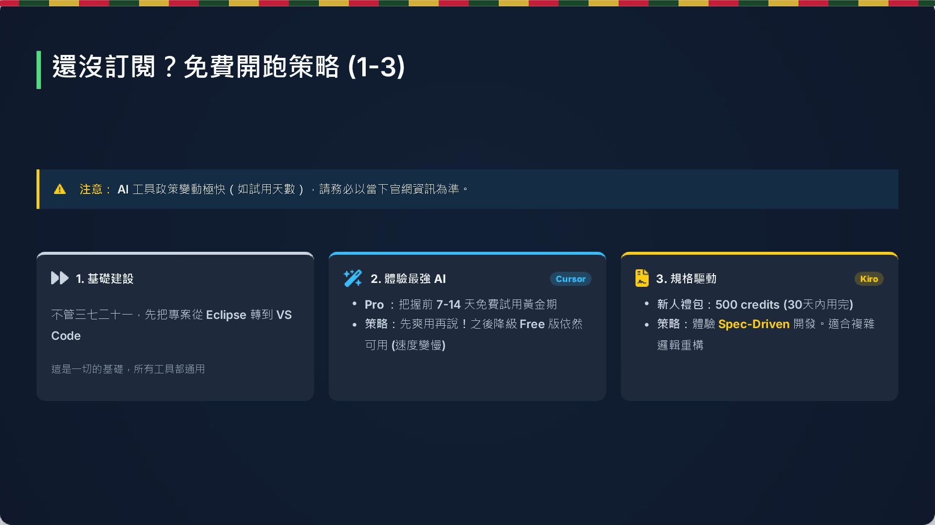 體驗最強 AI 3. 規格驅動 1. 基礎建設 • Pro :把握前 7-14 天免費試用黃金期 • 策略:先爽用再說!之後降級 Free 版依然 可用 (速度變慢) • 新人禮包:500 credits (30天內用完) • 策略:體驗 Spec-Driven 開發。適合複雜 邏輯重構 還沒訂閱?免費開跑策略 (1-3)