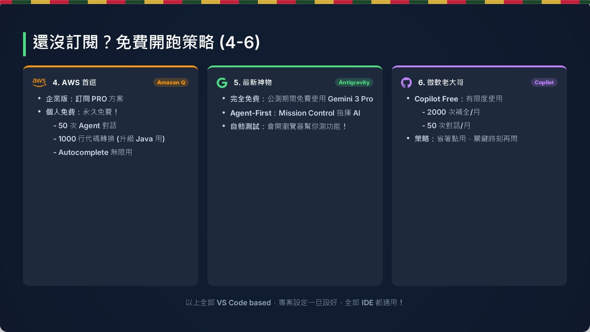 最新神物 6. 微軟老大哥 • 企業版:訂閱 PRO 方案 • 個人免費:永久免費! - 50 次 Agent 對話 - 1000 行代碼轉換 (升級 Java 用) - Autocomplete 無限用 • 完全免費:公測期間免費使用 Gemini 3 Pro • Agent-First:Mission Control 指揮 AI • 自動測試:會開瀏覽器幫你測功能! • Copilot Free:有限度使用 - 2000 次補全/月 - 50 次對話/月 • 策略:省著點用,關鍵時刻再問 還沒訂閱?免費開跑策略 (4-6)