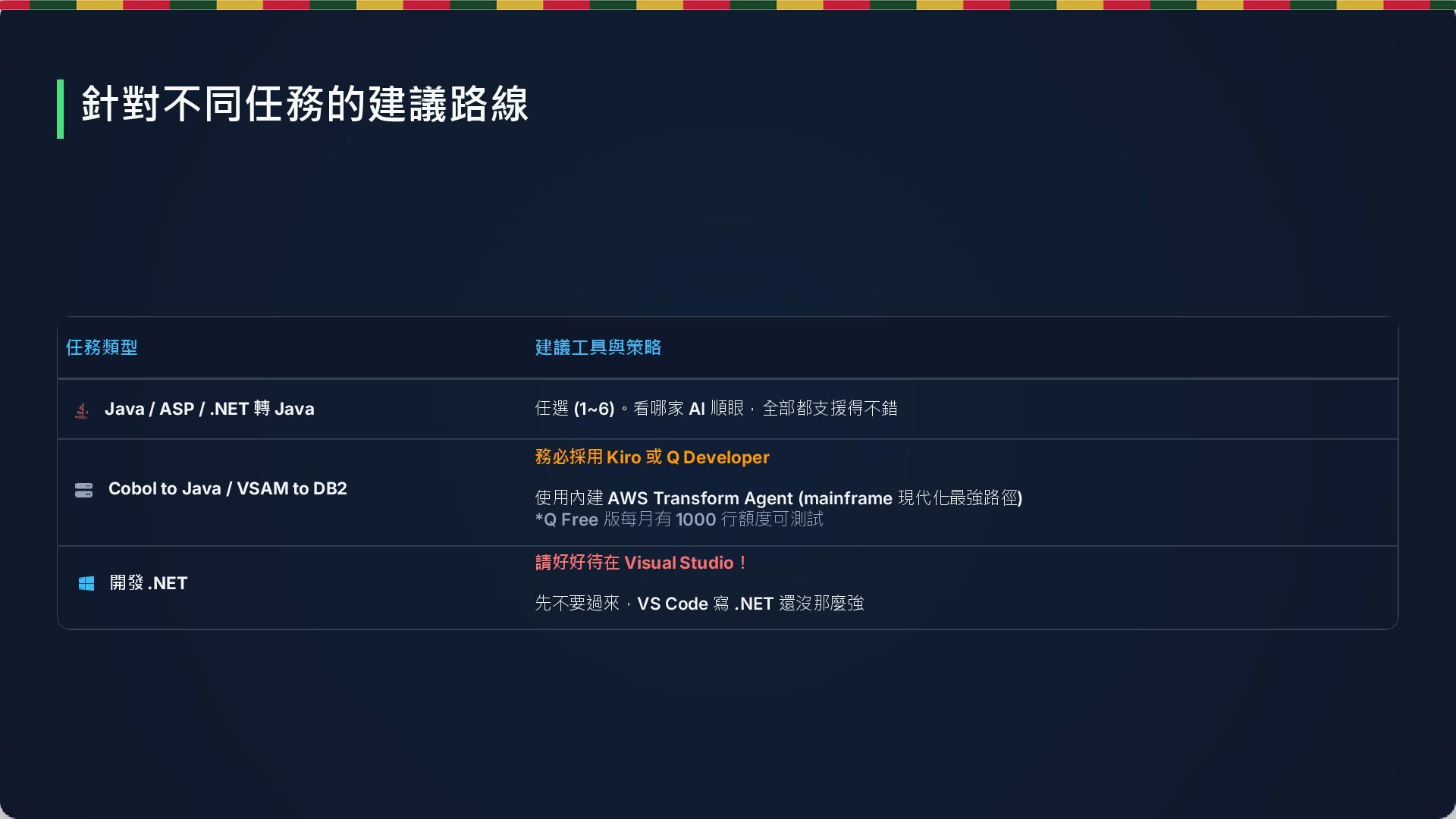 (1~6)。看哪家 AI 順眼,全部都支援得不錯 Cobol to Java / VSAM to DB2 務必採用 Kiro 或 Q Developer 使用內建 AWS Transform Agent (mainframe 現代化最強路徑) *Q Free 版每月有 1000 行額度可測試 開發 .NET 請好好待在 Visual Studio! 先不要過來,VS Code 寫 .NET 還沒那麼強 針對不同任務的建議路線
