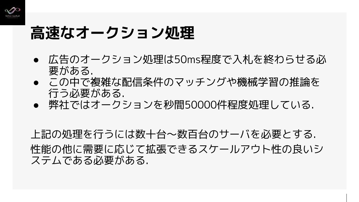 メディア情報 … データレイク データ処理 分析処理 ストリーム処 理 データ収集 サーバ オークション サーバ オークション サーバ 入 札 他 の シ ス テ ム … … 各種機能は整合性が取れて いる必要があり、同期を行った りする 分析者