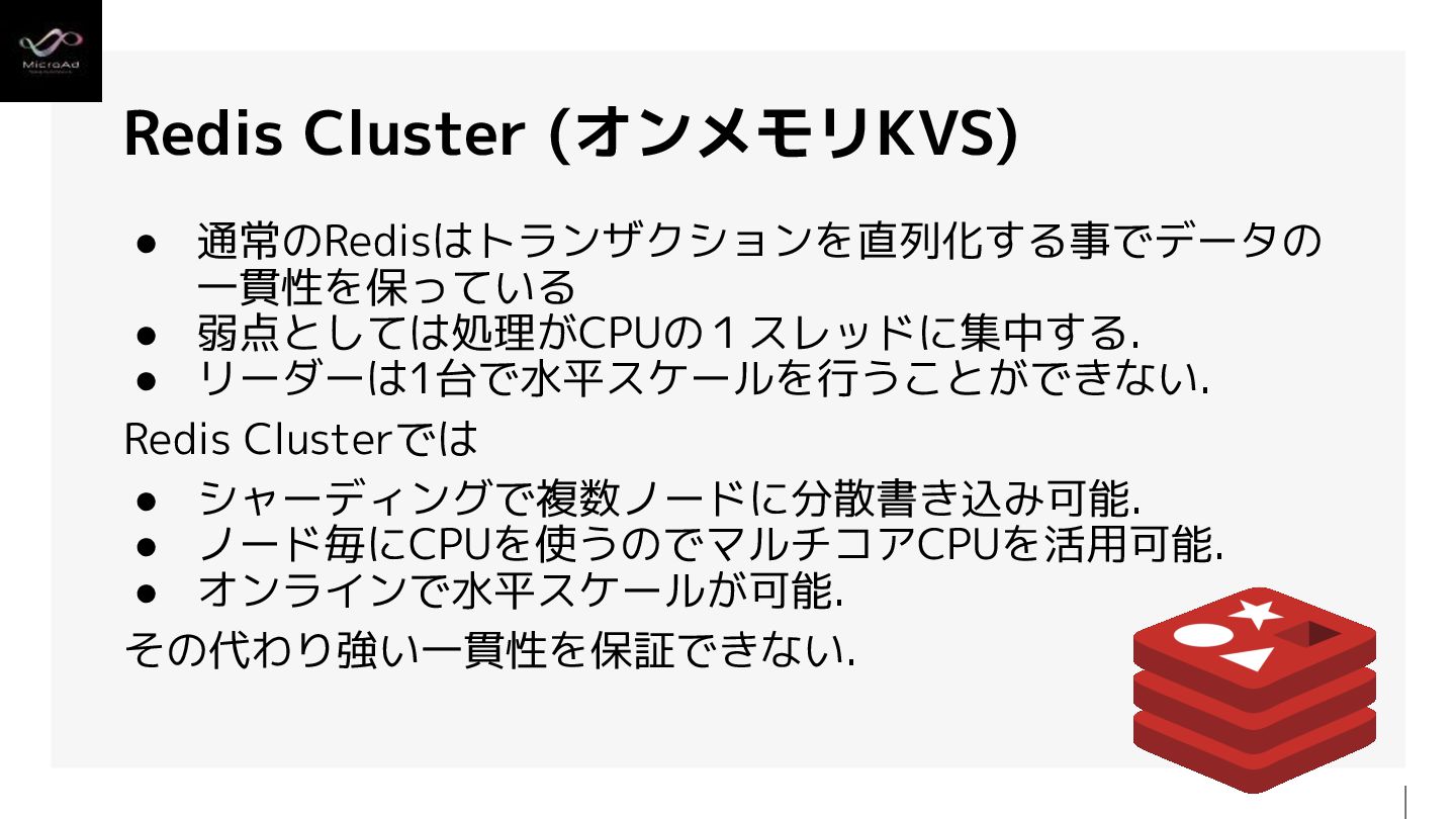 Redis Clusterでは • シャーディングで複数ノードに分散書き込み可能. • ノード毎にCPUを使うのでマルチコアCPUを活用可能. • オンラインで水平スケールが可能. その代わり強い一貫性を保証できない.