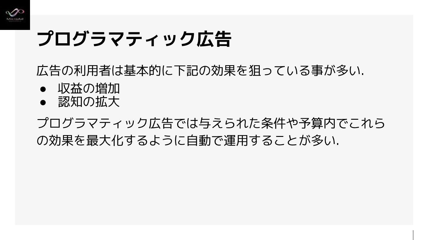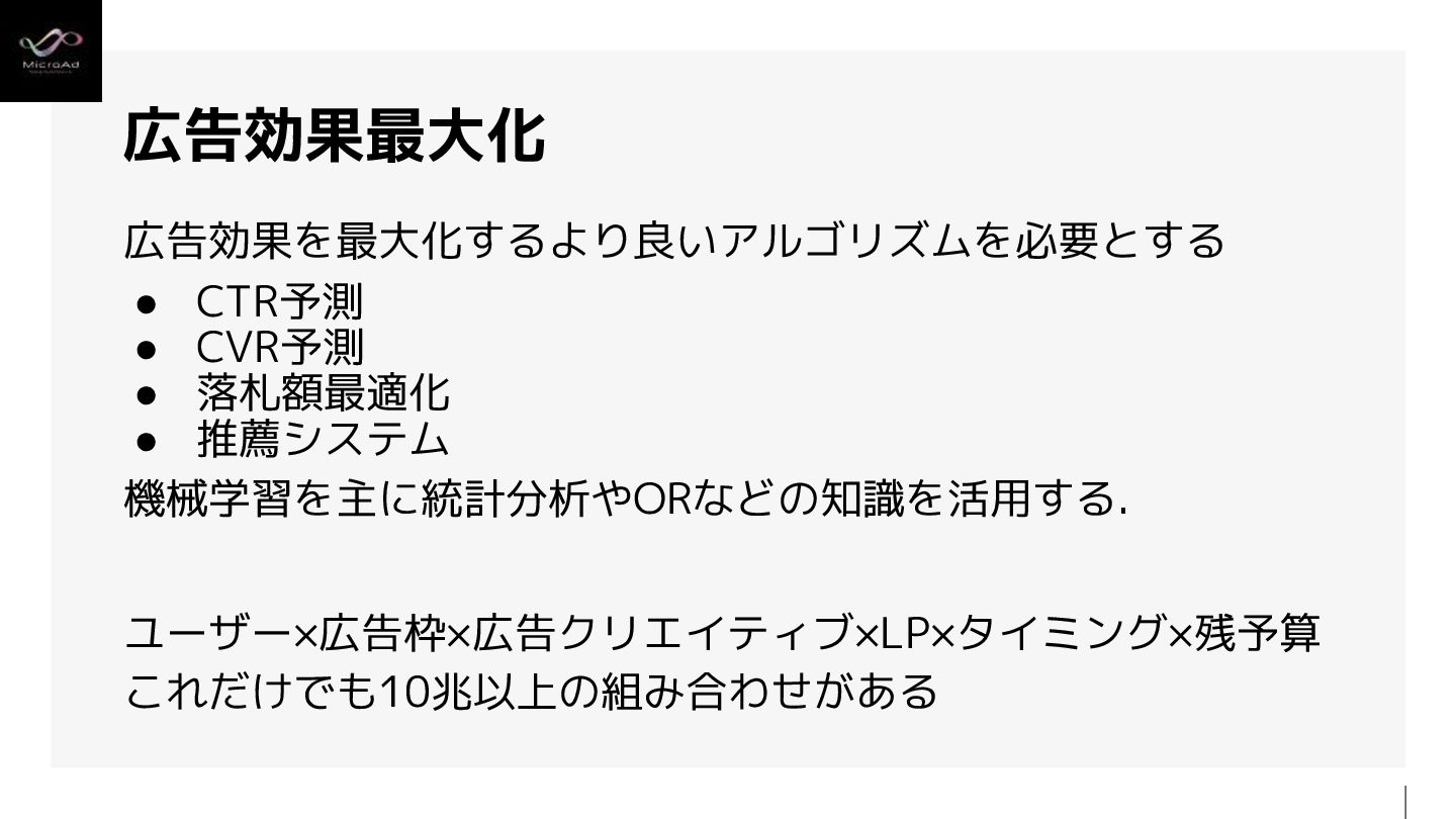 2. 広告効果を最大化するより良いアルゴリズムを必要とする • CTR予測 • CVR予測 • 落札額最適化 • 推薦システム 機械学習を主に統計分析やORなどの知識を活用する.