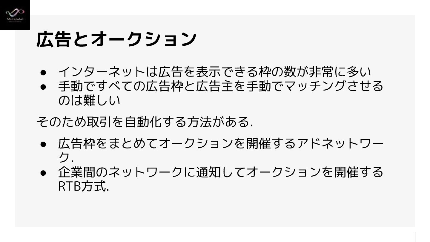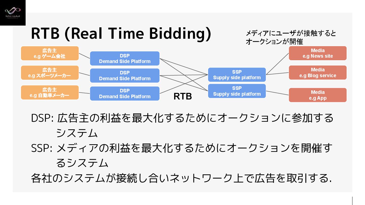 1. DSP: 広告主の利益を最大化するためにオークションに参加する システム SSP: メディアの利益を最大化するためにオークションを開催す るシステム 各社のシステムが接続し合いネットワーク上で広告を取引する. RTB (Real Time
